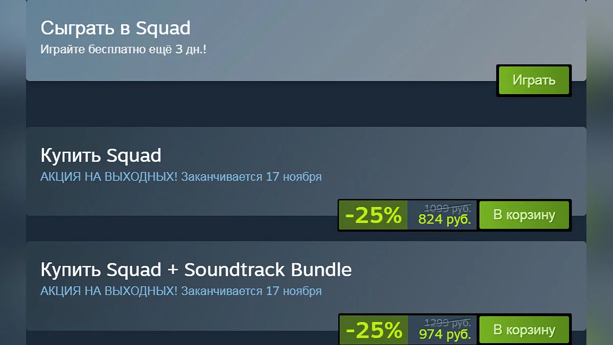 Традиционно в четверг в Steam запустили бесплатные выходные. На этот раз акция проходит в реалистичном онлайн-шутере с видом от первого лица Squad. Сыграть в него может любой пользователь сервиса Valve до 14 ноября. Кроме того, до 17 ноября игра продаётся со скидкой 25% за 824 рубля.