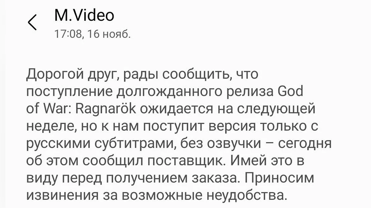 В сети «М.Видео-Эльдорадо» сообщили, что диски God of War: Ragnarok, которые появятся в продаже, не получат озвучку на русском языке. Об этом сообщается в рассылке для покупателей. Ранее компания не уточняла, планируется ли в игре локализация, но теперь стало известно, что её не будет. Придётся обойтись субтитрами.