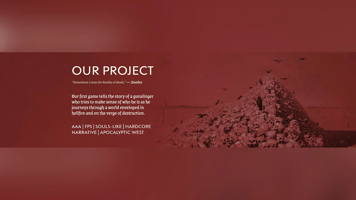 Первым проектом студии станет сюжетный AAA-шутер от первого лица, разрабатываемый на Unreal Engine 5. Сеттинг будет довольно мрачный — на главной сайте его иллюстрирует картина «Апофеоз войны» с грудой черепов.