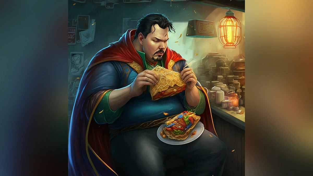 На сгенерированных по описанию изображениях можно увидеть девять известных персонажей из комиксов Marvel и DC, которые подсели на поедание пиццы, бургеров и пончиков. Есть Человек-паук, Бэтмен, Супермен, Железный человек, Капитан Америка, Тор, Доктор Стрэндж, Халк и Танос.
