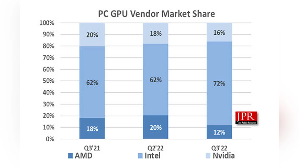 Аналитики из Jon Peddie Research сообщили, что по итогам третьего квартала на рынок поставили 75,5 млн графических процессоров для видеокарт. Это на 25,1% меньше, чем годом ранее и на 10,3% меньше второго квартала.
