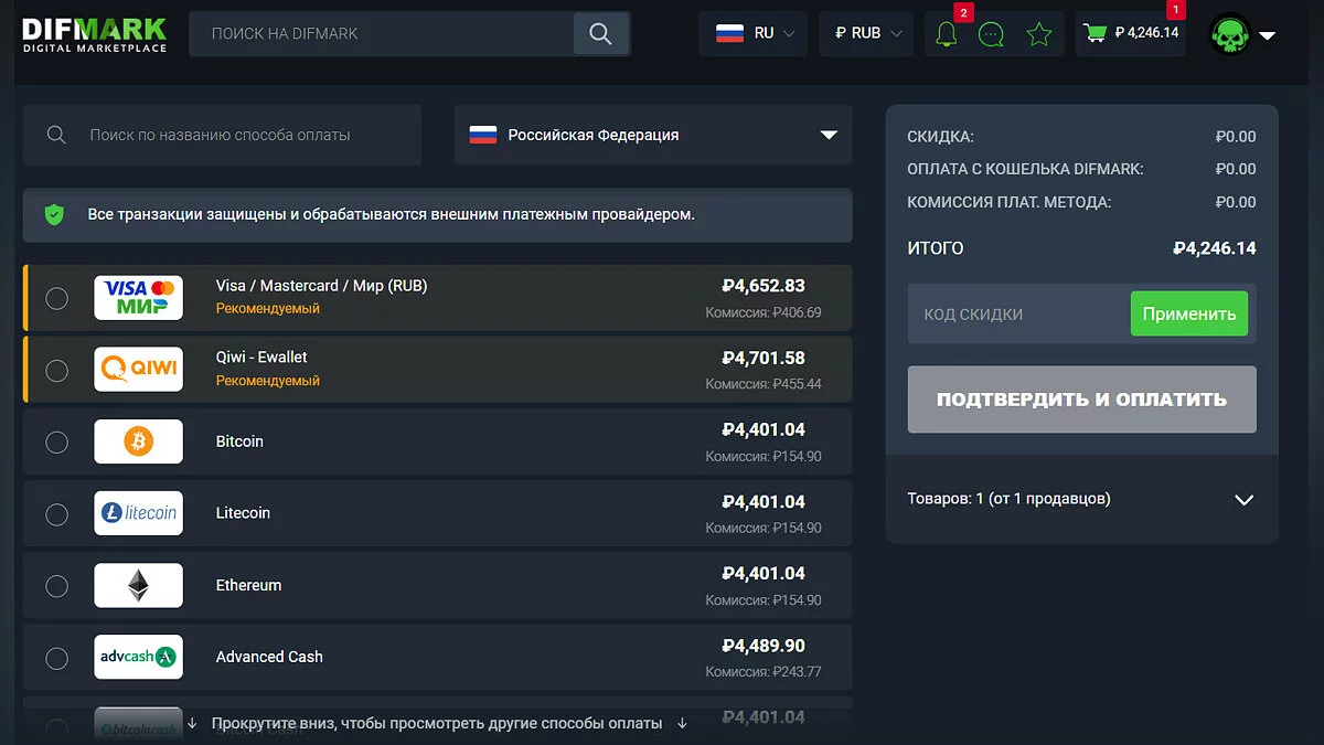 Перед оплатой необходимо выбрать сервис, через который будет произведена транзакция. К примеру, оплатить заказ в рублях можно с помощью QIWI-кошелька.