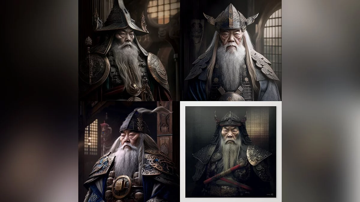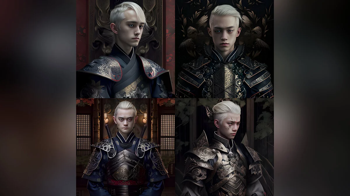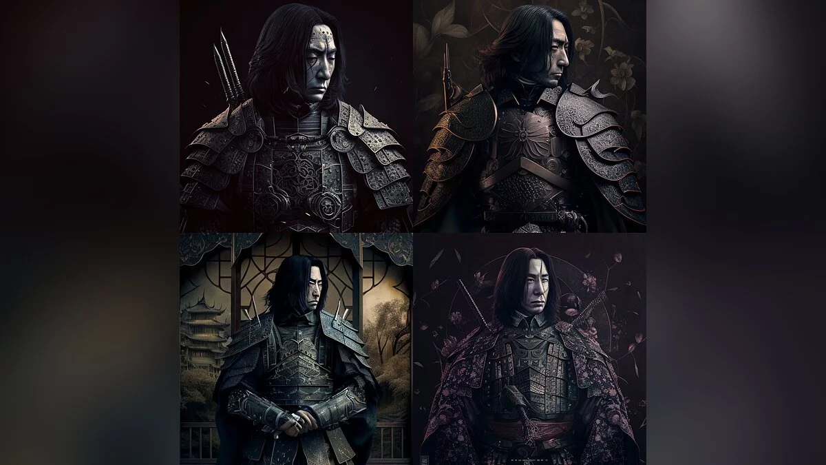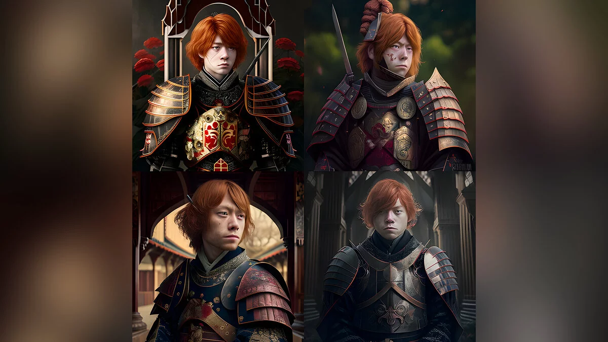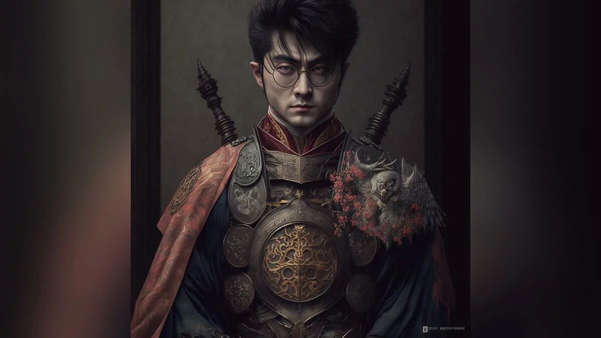 Автор поста с ником cassien-crombez отметил, что для создания иллюстраций использовались следующие команды: «Harry Potter in a samurai armor», «Intricate details», «Japanese temple background» и «Ultra realistic».