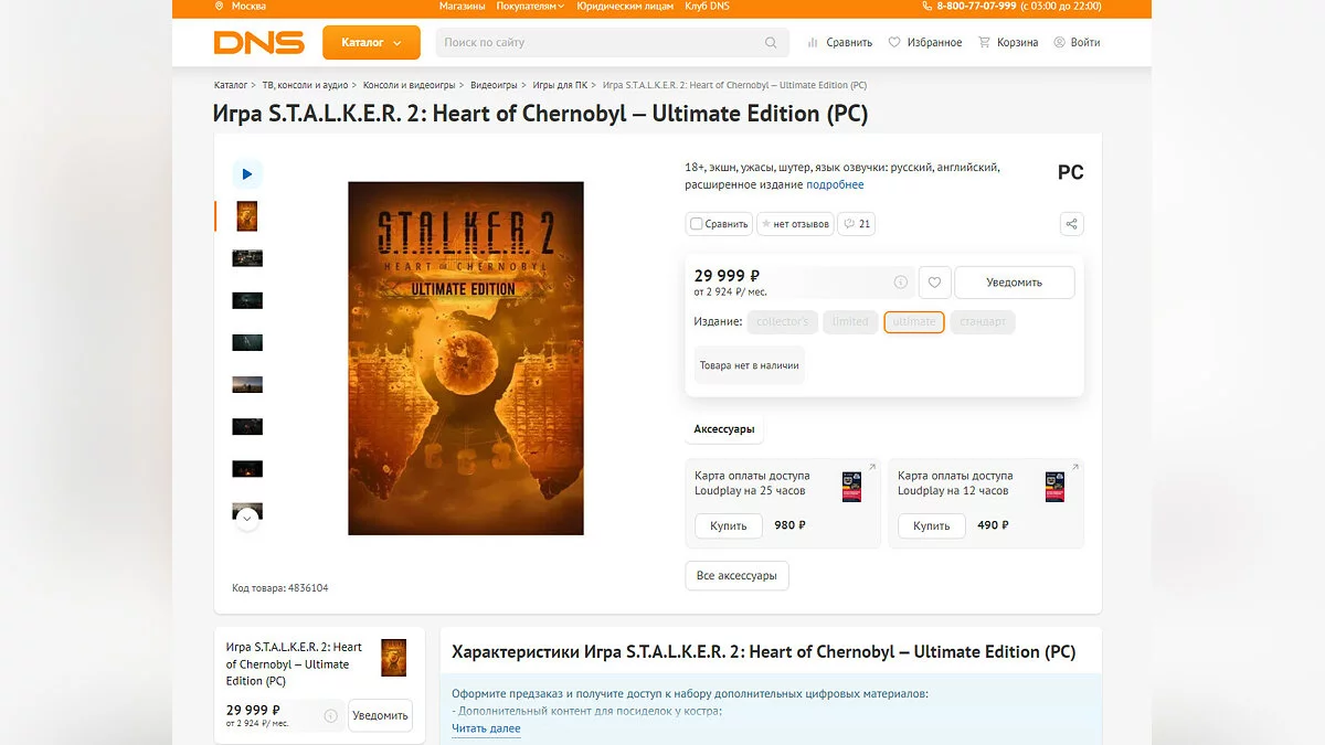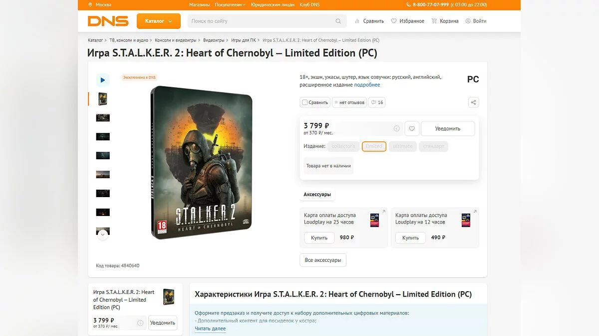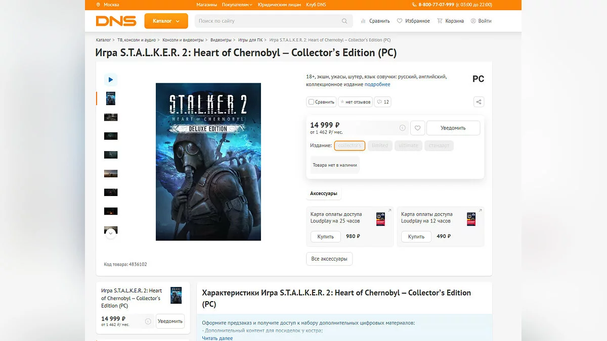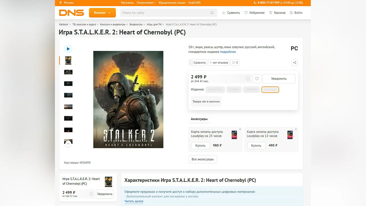 На сайте сети магазинов DNS обнаружились предзаказы игры S.T.A.L.K.E.R. 2, которую ранее GSC Game World отказалась продавать на территории России. Пока неясно, является ли это ошибкой. Возможно, страницы попросту забыли удалить.