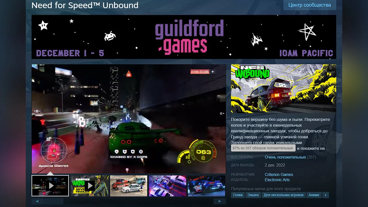 Сегодня (2 декабря) состоялся полноценный релиз аркадной гоночной игры Need for Speed Unbound. Ранее проект был доступен только тем, кто предзаказал делюкс-издание. В Steam геймеры уже поставили первые оценки.