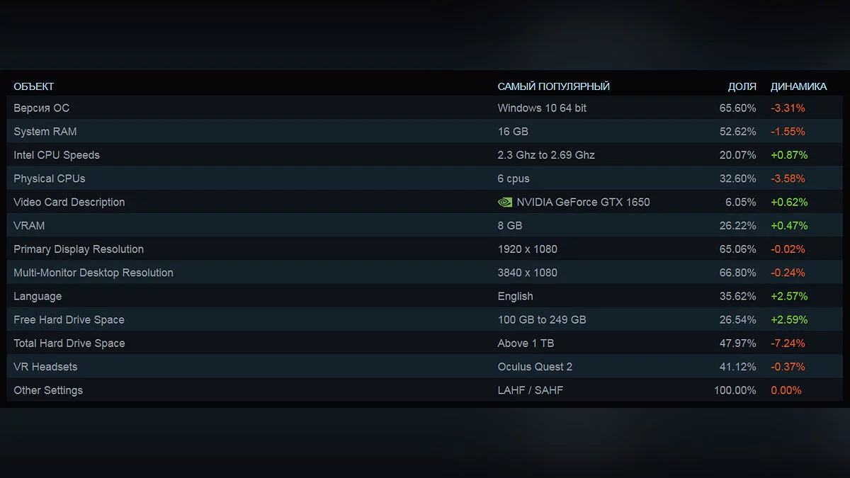 Самой популярной видеокартой неожиданно оказалась NVIDIA GTX 1650 — её используют 6.05% игроков. Она сместила NVIDIA GTX 1060, которая лидировала в Steam на протяжении нескольких лет. Количество пользователей с Windows 10 уменьшилось на 3.31%, а игроков с Windows 11 — увеличилось на 4.61%.