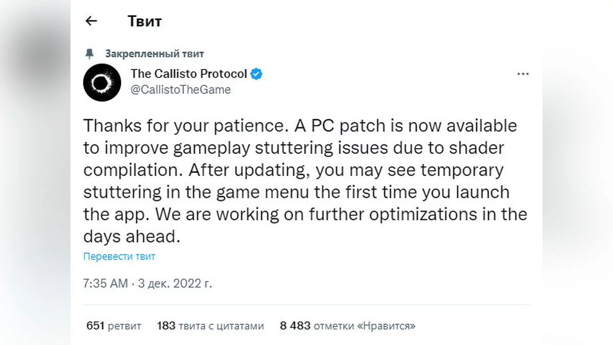 ПК-версия космического хоррора The Callisto Protocol, которую разгромили геймеры из-за ужасной оптимизации, получила первый патч. О выходе обновления разработчики сообщили в Twitter. Они поблагодарили игроков за терпение и отметили, что уже работают над новым патчем.