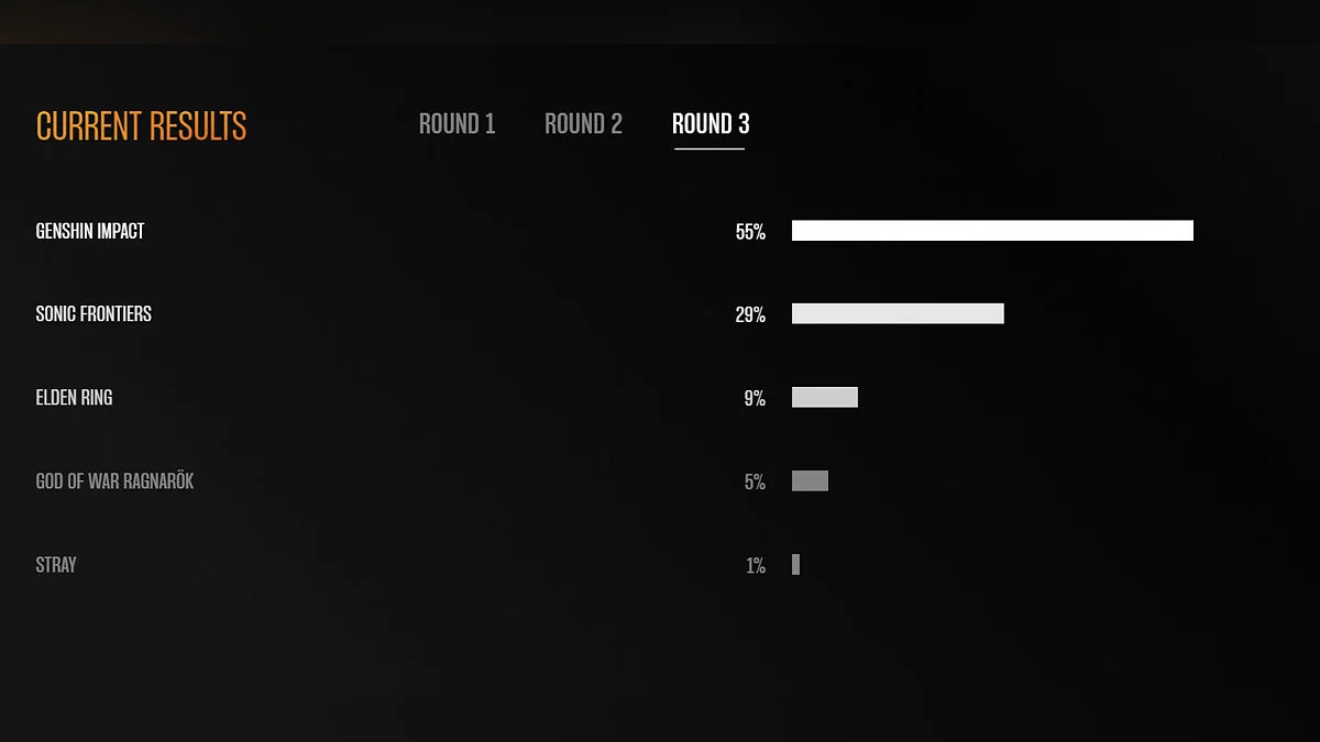 На официальном сайте The Game Awards 2022 стартовал третий этап пользовательского голосования за лучшую игру 2022 года. Осталось пять номинантов: Elden Ring, Genshin Impact, God of War: Ragnarok, Sonic Frontiers и Stray.