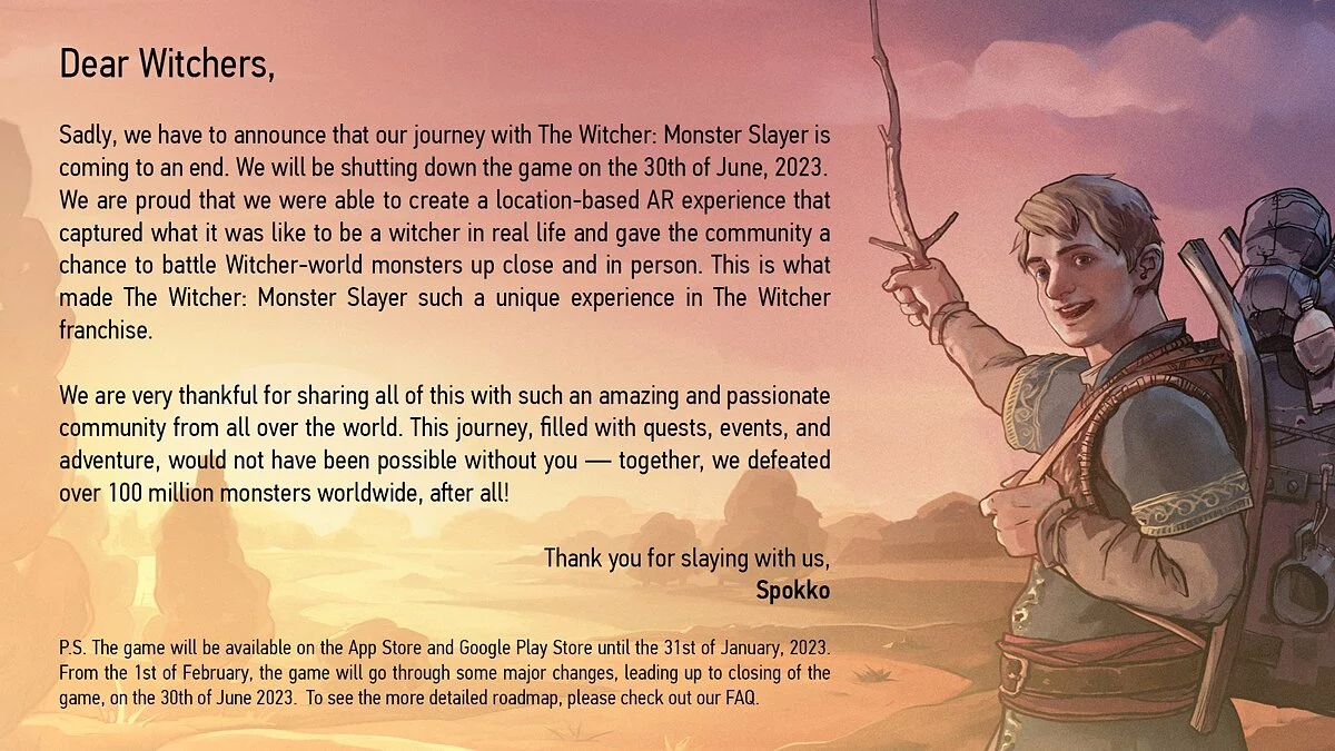 31 января 2023 года проект уберут из сервисов App Store и Google Play, а 30 июня отключат сервера. Причиной закрытия стала низкая популярность игры — она не стала коммерчески успешной. Сотрудников студии Spokko, которая разработала The Witcher: Monster Slayer, перенаправят на другие проекты CD Projekt.