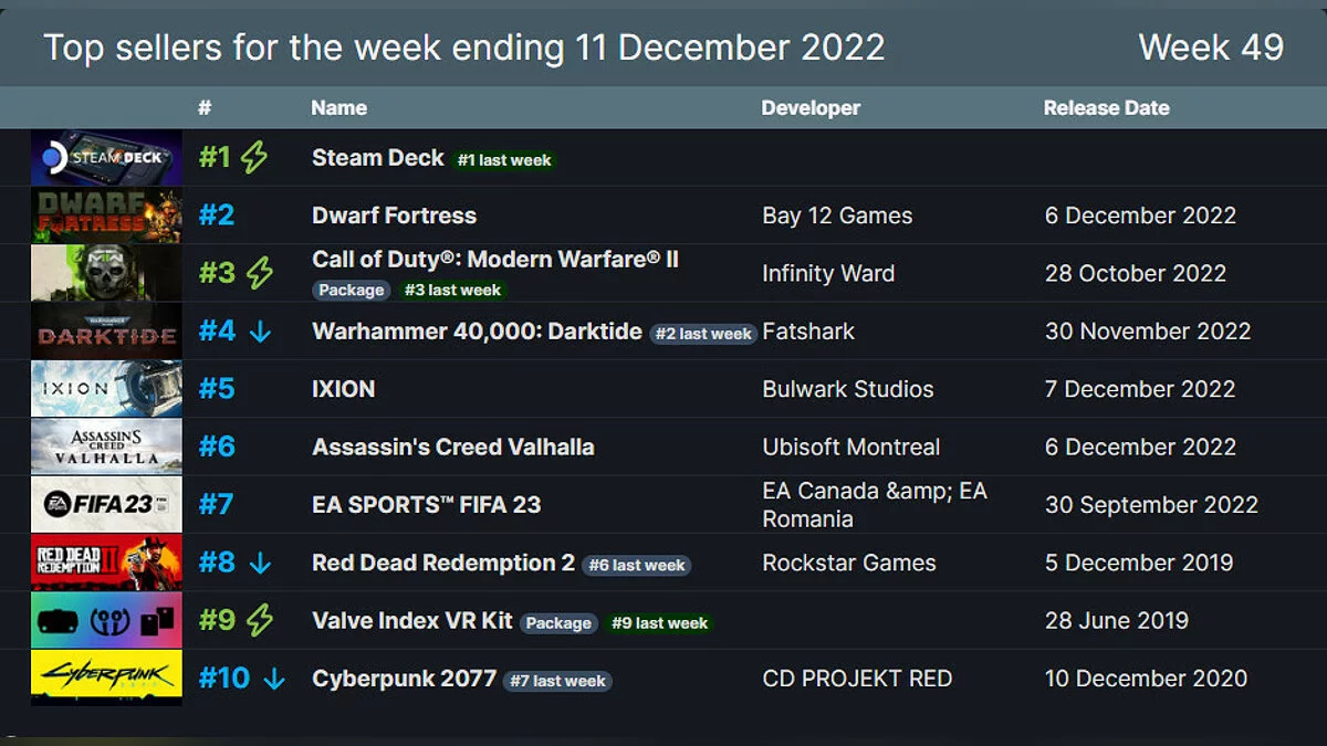 Другие две новинки в Steam, космическая стратегия IXION и Assassin's Creed Valhalla, стартовали с пятого и шестого мест соответственно.