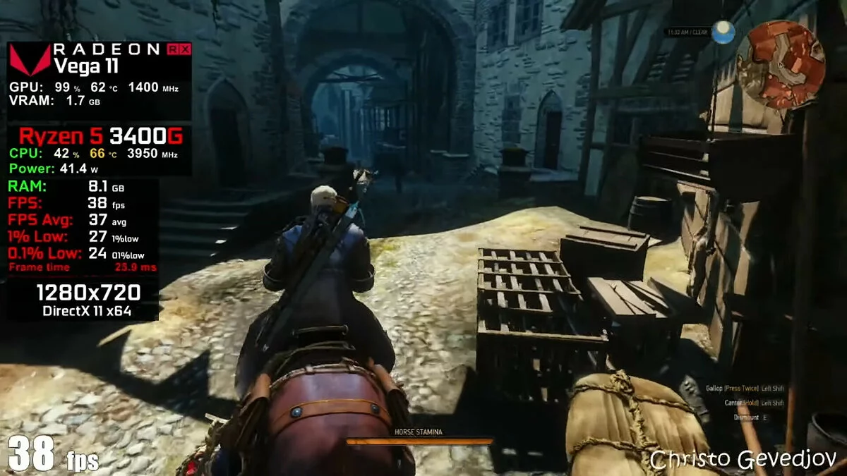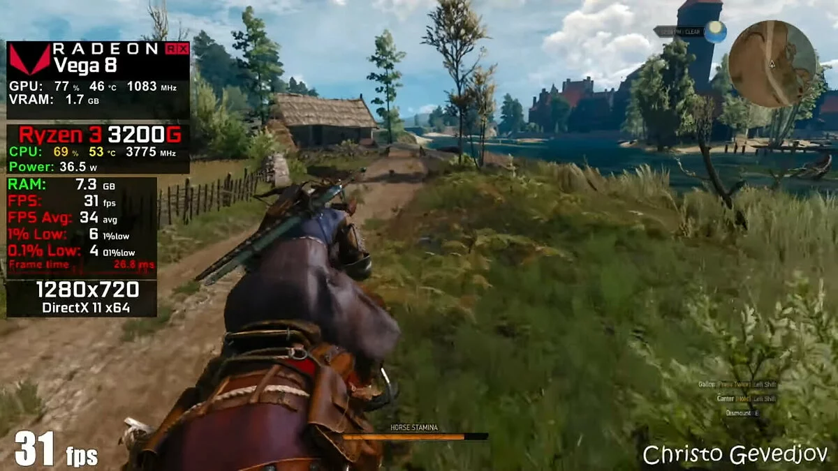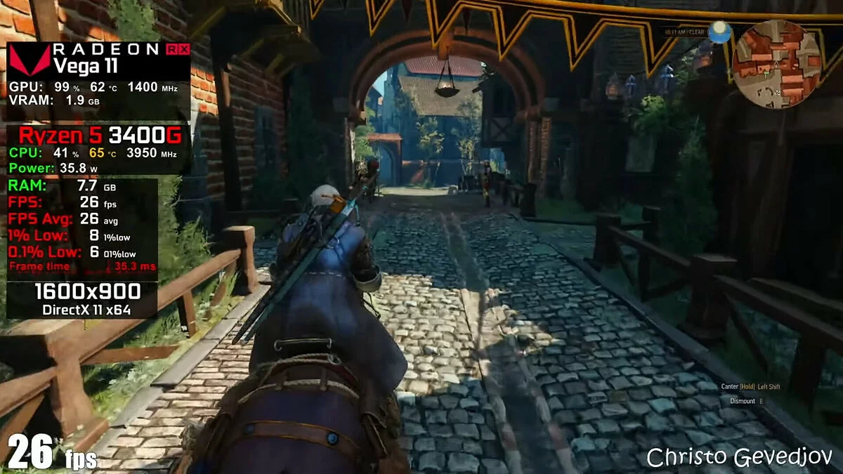 - Ryzen 5 3400G Vega 11 — (900p и низкие настройки графики) — около 24-30 FPS;