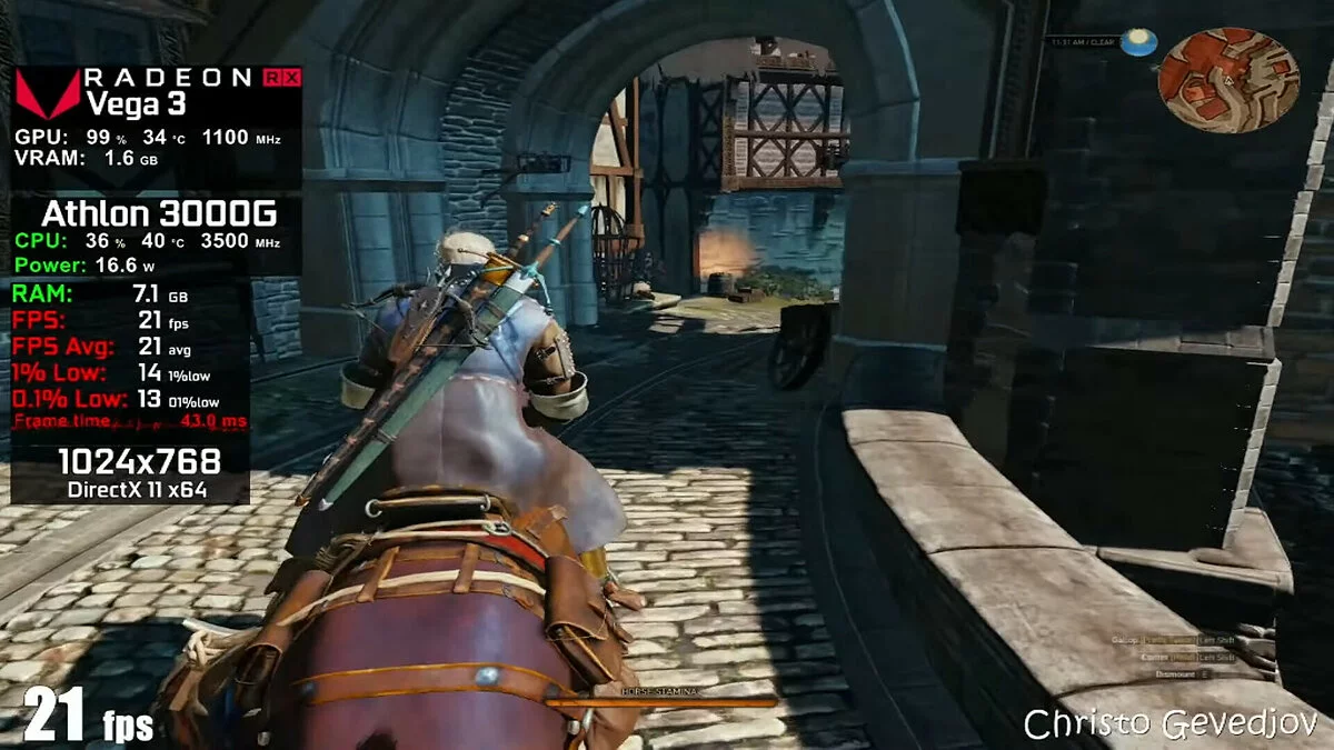 - Athlon 3000G Vega 3 — (720p и низкие настройки графики) — около 21-24 FPS.