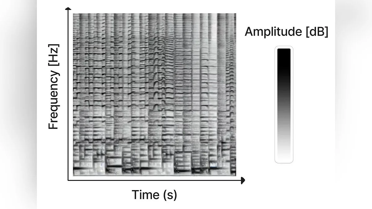 Идея состоит в том, что Stable Diffusion генерирует так называемые сонограммы или спектрограммы — визуальное представление музыки. Это обычная плоская картинка, где по на оси X показан порядок воспроизведения частот слева направо, а по оси Y — частота звука. Цвет пикселя же задаёт амплитуду звука в каждый момент времени.