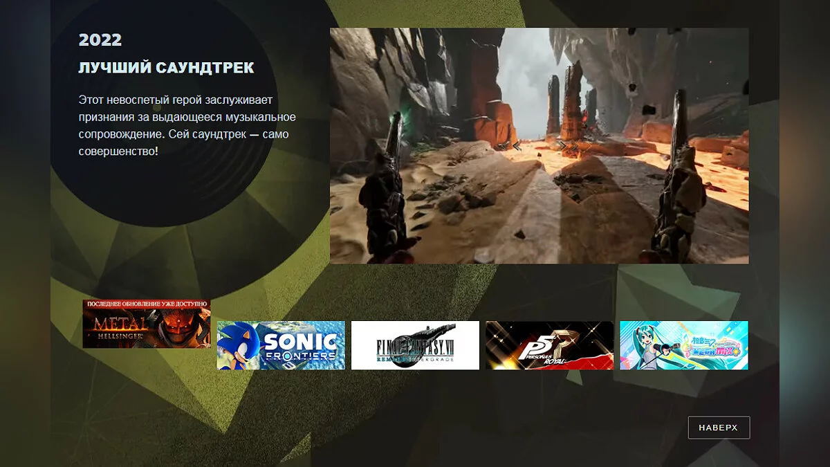 В списке представлены пять игры, которые, как отметила Valve, «заслуживают признания за выдающееся музыкальное сопровождение». Примечательно, что четыре из пяти игр созданы в Японии и не доступны для покупки в России.