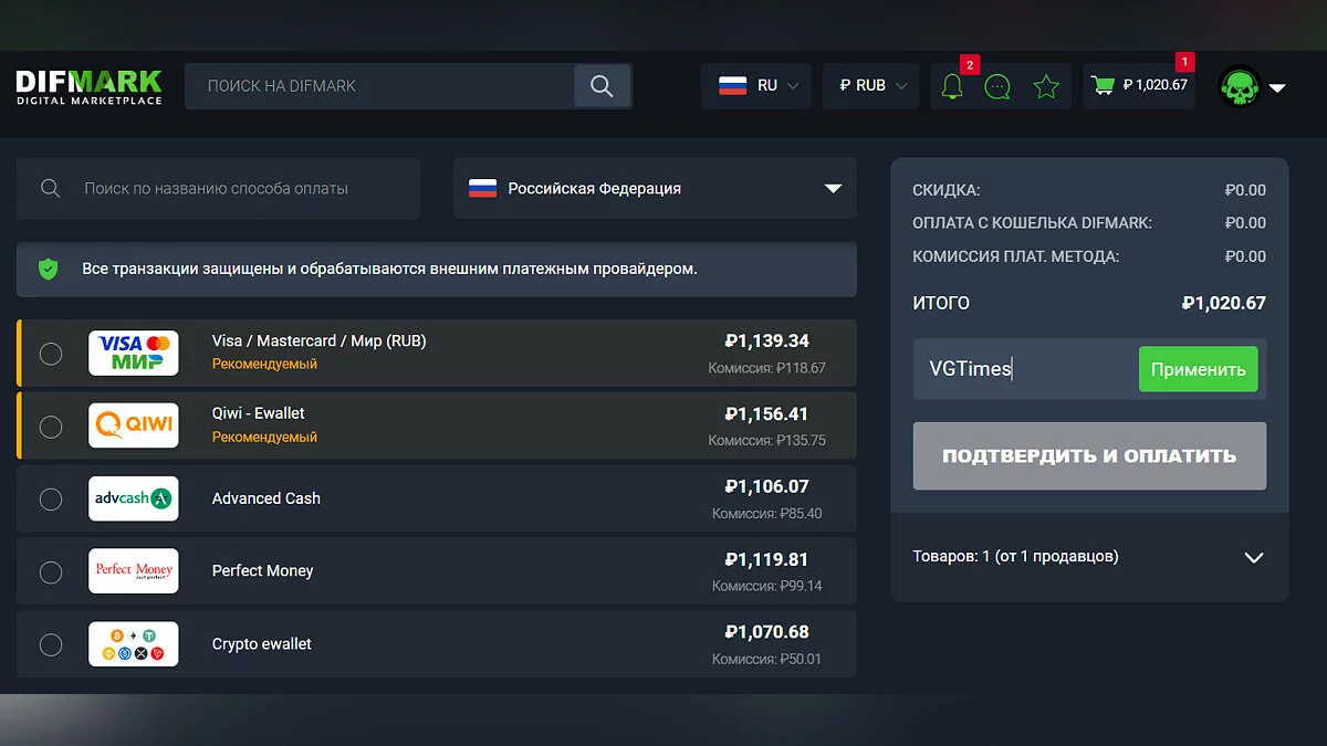 Получить дополнительную скидку при покупке можно с помощью специального промокода. Для этого в поле «Код скидки» нужно вставить VGTimes и нажать кнопку «Применить». Стоимость товара снизится на 10%. Промокод можно использовать абсолютно ко всем покупкам на площадке.