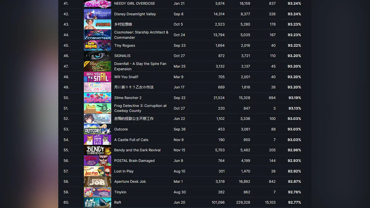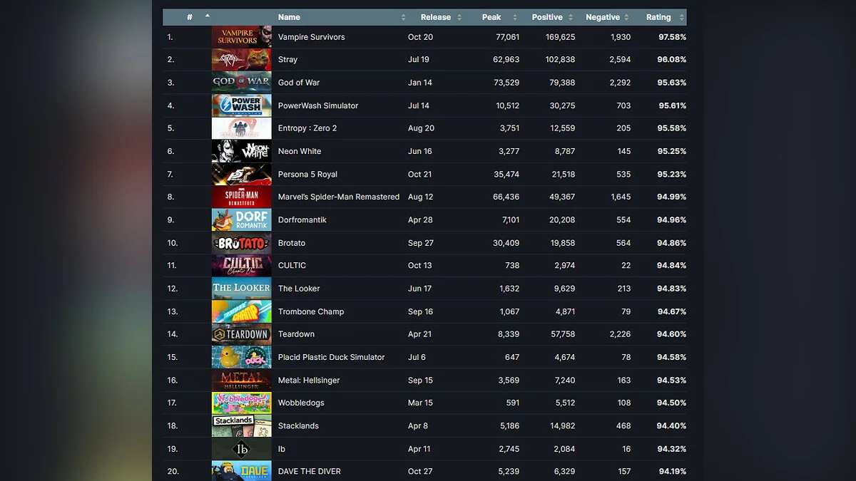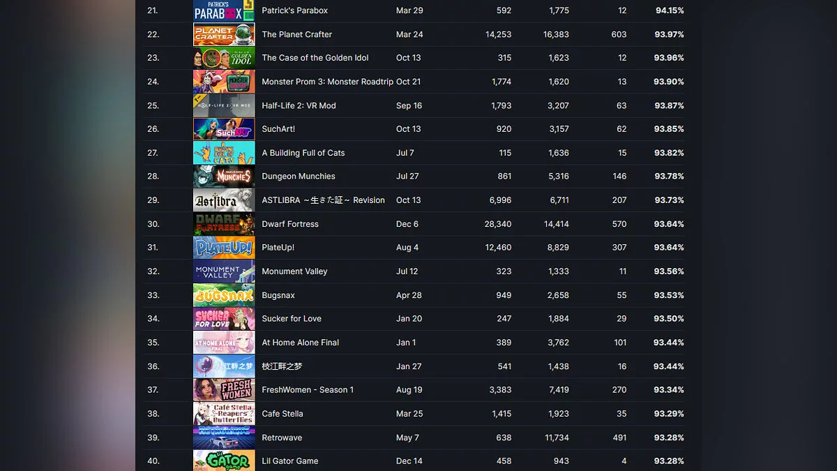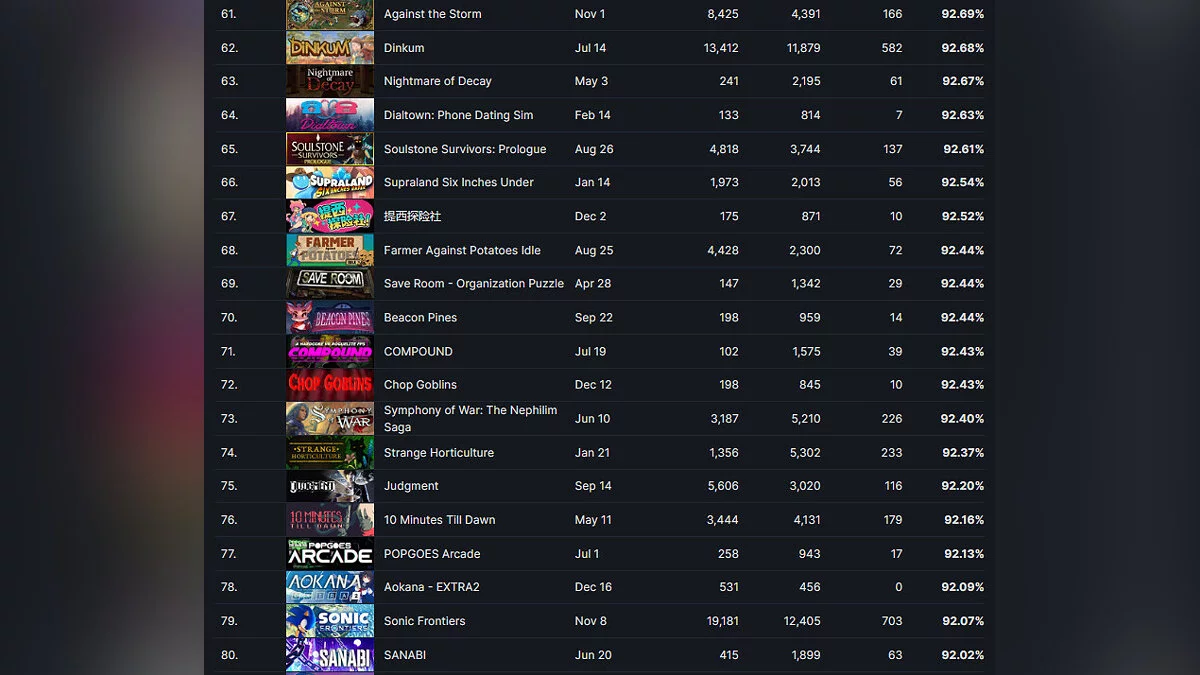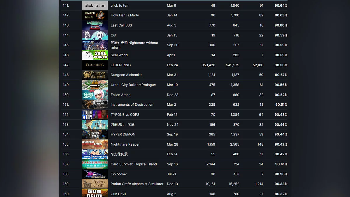 Как и многие порталы сервис SteamDB решил подвести итоги года, назвав самые топовые релизы этого года в магазине Steam. Примечательно, что лучшая игра этого года по версии TGA 2022, Elden Ring (рейтинг 90,58%), оказалась лишь на 147 месте.