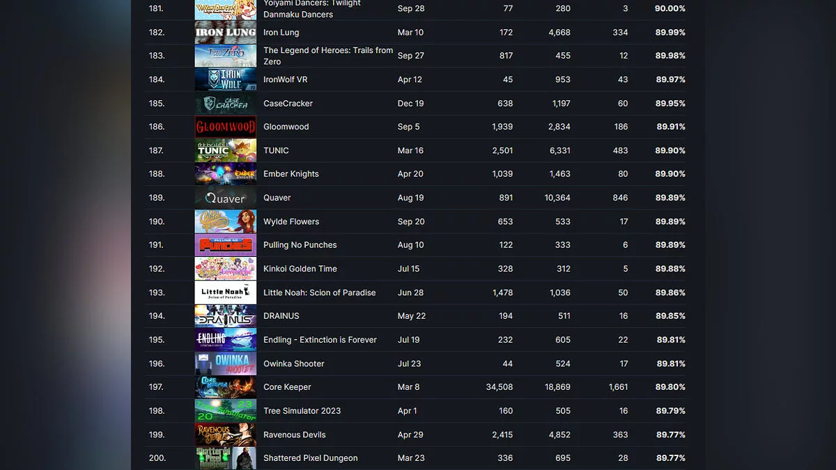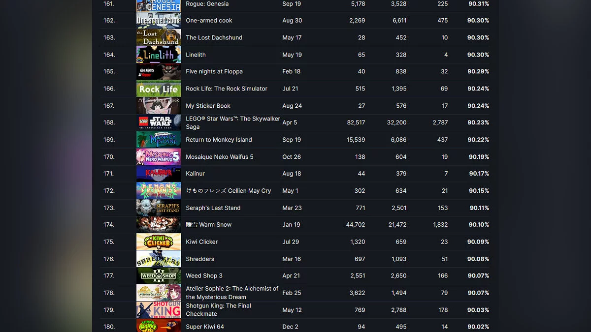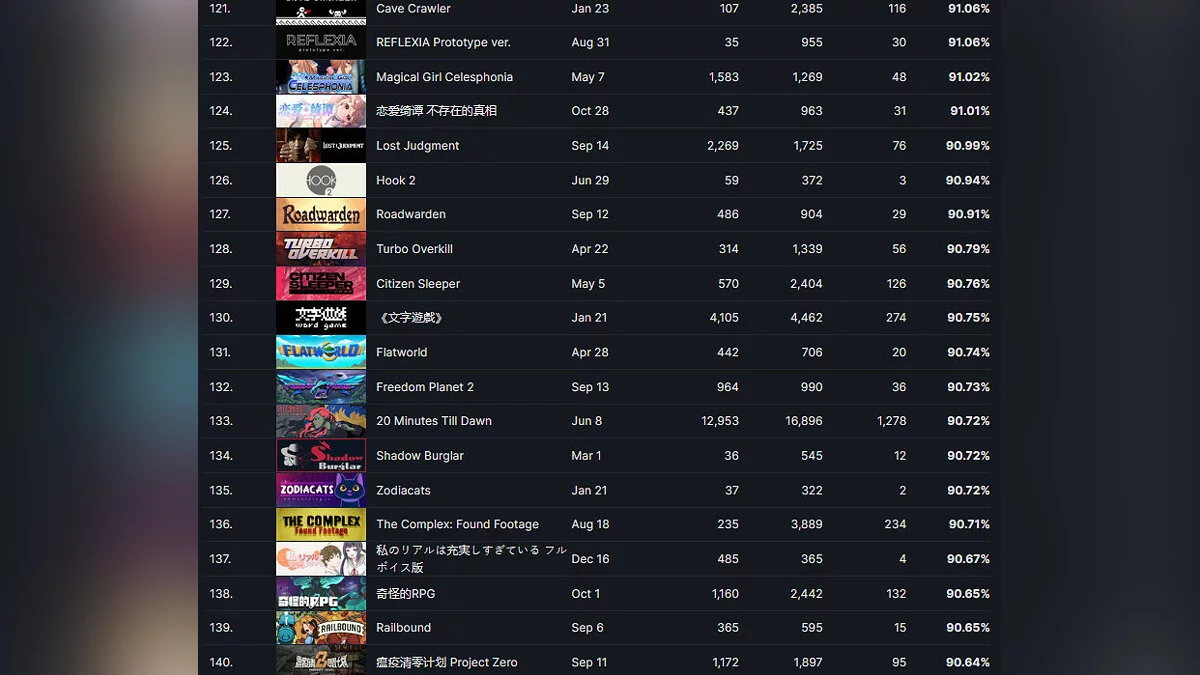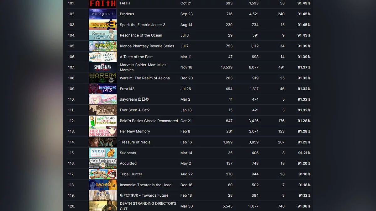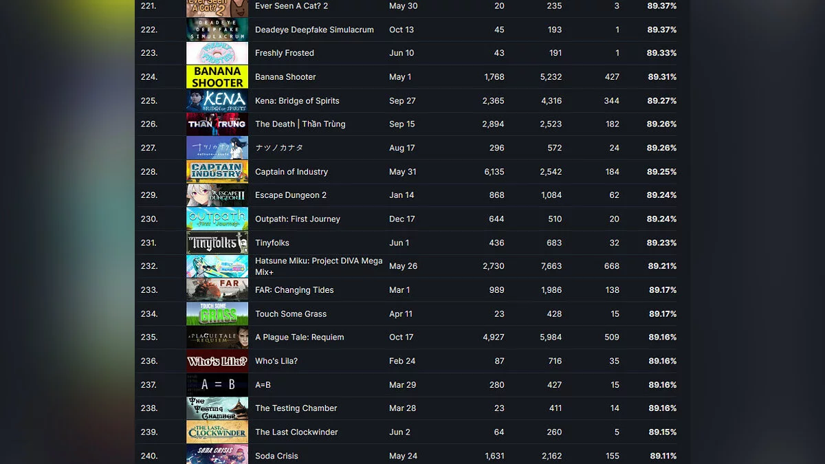 Как и многие порталы сервис SteamDB решил подвести итоги года, назвав самые топовые релизы этого года в магазине Steam. Примечательно, что лучшая игра этого года по версии TGA 2022, Elden Ring (рейтинг 90,58%), оказалась лишь на 147 месте.