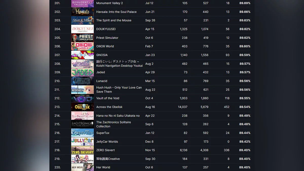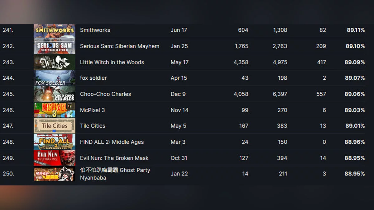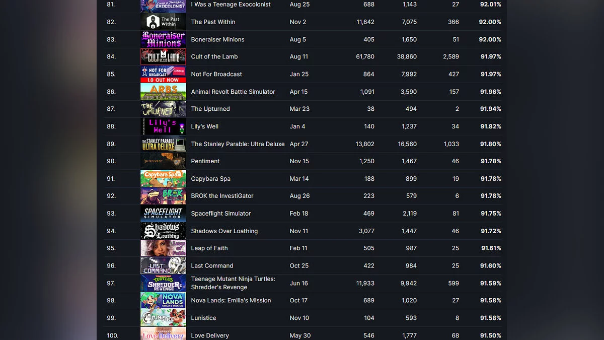 В отчете говорится: «С 2017 года платформа использует формулу, которая следует двум простым правилам: 1) чем больше обзоров у игры, тем больше у SteamDB уверенности в том, что ее оценка верна; 2) все оценки должны быть смещены в сторону среднего рейтинга (50%)».