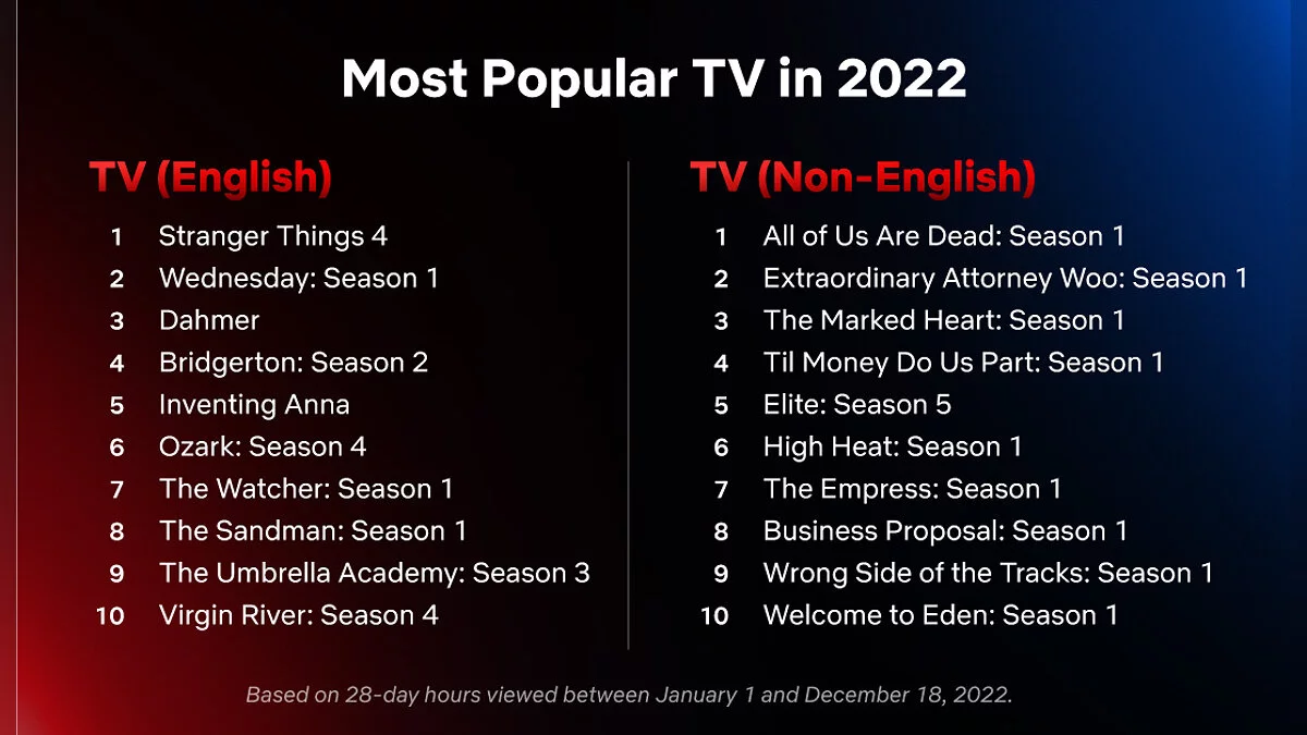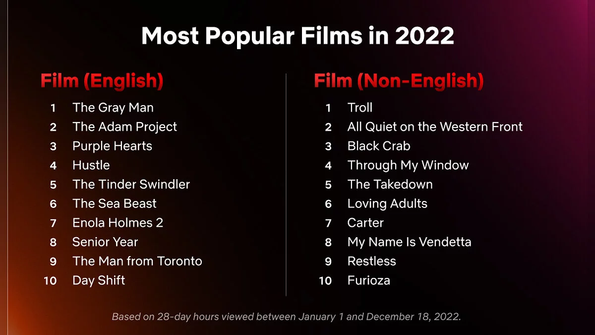 Netflix тоже решила подвести итоги и назвала самые популярные фильмы и сериалы за 2022 год. При составлении топов учитывалось суммарное количество часов, которое подписчики потратили на просмотр.