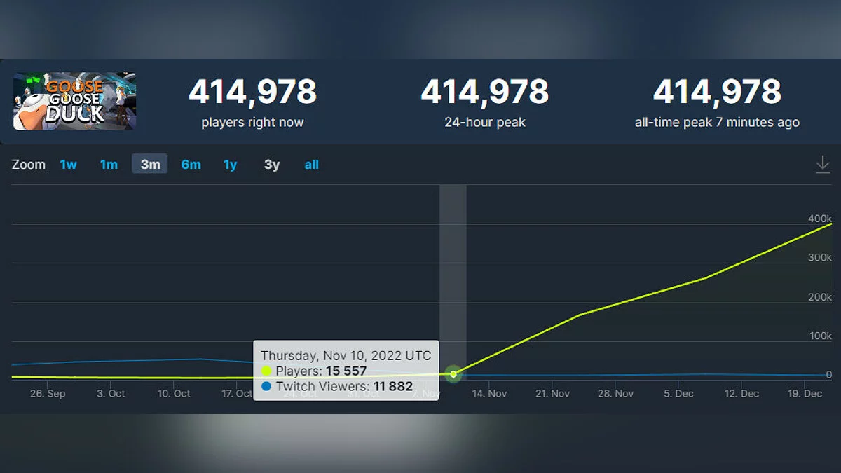 На самом деле Goose Goose Duck вышла уже довольно давно — 3 октября 2021 года, однако резкий скачок популярности произошёл в ноябре этого года. С тех пор популярность стремительно росла. Сейчас по текущему онлайну в Steam проект уступает лишь трём играм — CS:GO, Dota 2 и PUBG: Battlegrounds.