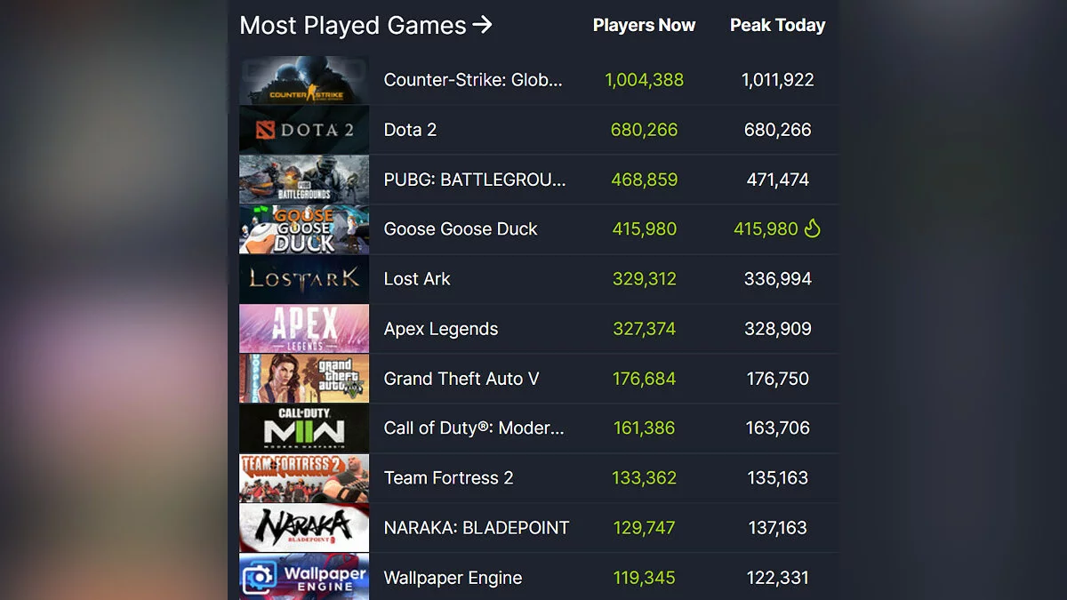 В сервисе Steam появился новый суперхит — бесплатный клон Among Us про гусей под названием Goose Goose Duck собрал 400 тысяч игроков в «онлайне». Проект обогнал Apex Legends, Lost Ark, GTA 5, Warzone 2 и другие хиты.