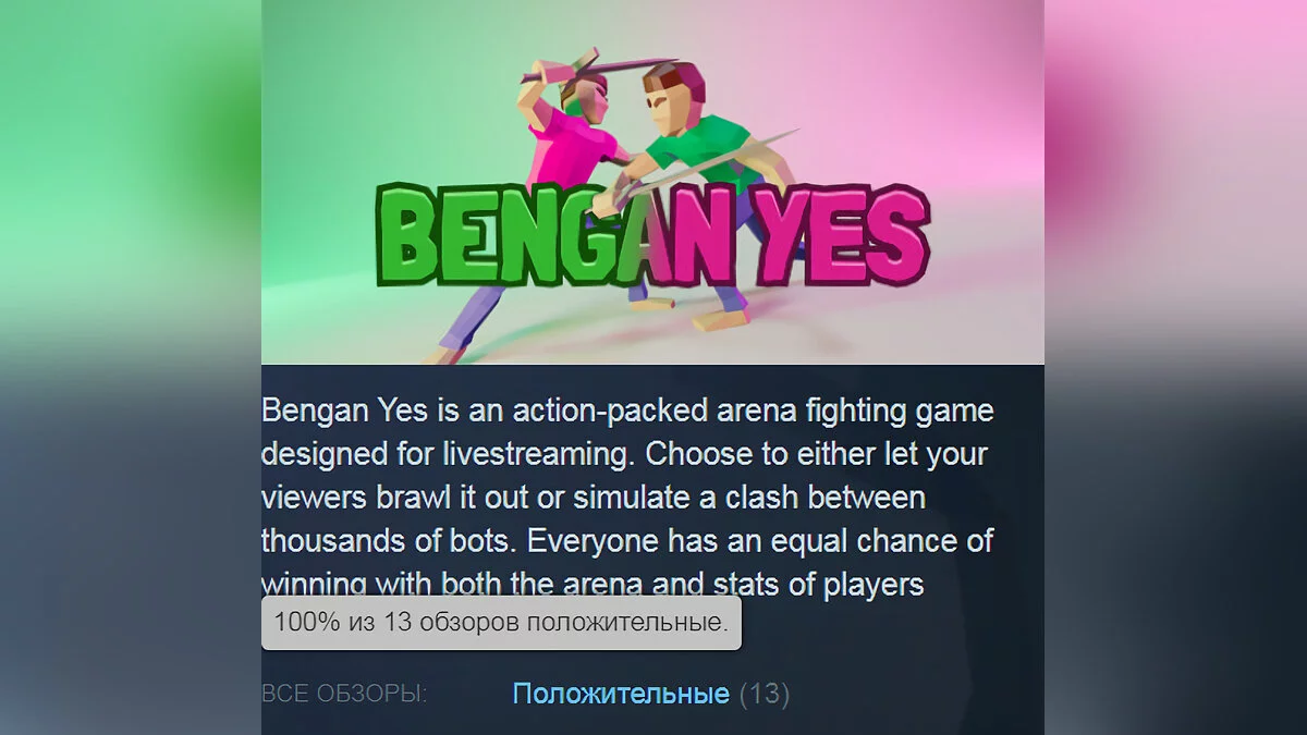 Bengan Yes — файтинг, предназначенный для стримеров и их зрителей (есть интеграция с Twitch). Стример может позволить зрителям драться или имитировать сражение тысячи ботов. У всех равные шансы на победу, а арена и характеристики игроков рандомизированы. Страница в Steam.