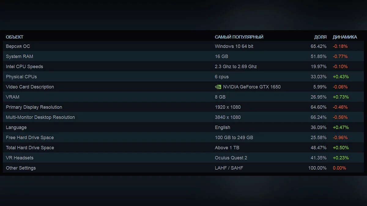 Самой популярной видеокартой снова стала NVIDIA GeForce GTX 1650 — в прошлом месяце, напомним, она обогнала GTX 1060, которая лидировала на протяжении нескольких лет. За последние 30 дней количество игроков, которые используют GTX 1650, снизилось на 0,06%. Наибольший рост показала NVIDIA GeForce RTX 3060. Количество её обладателей увеличилось на 0,45%.