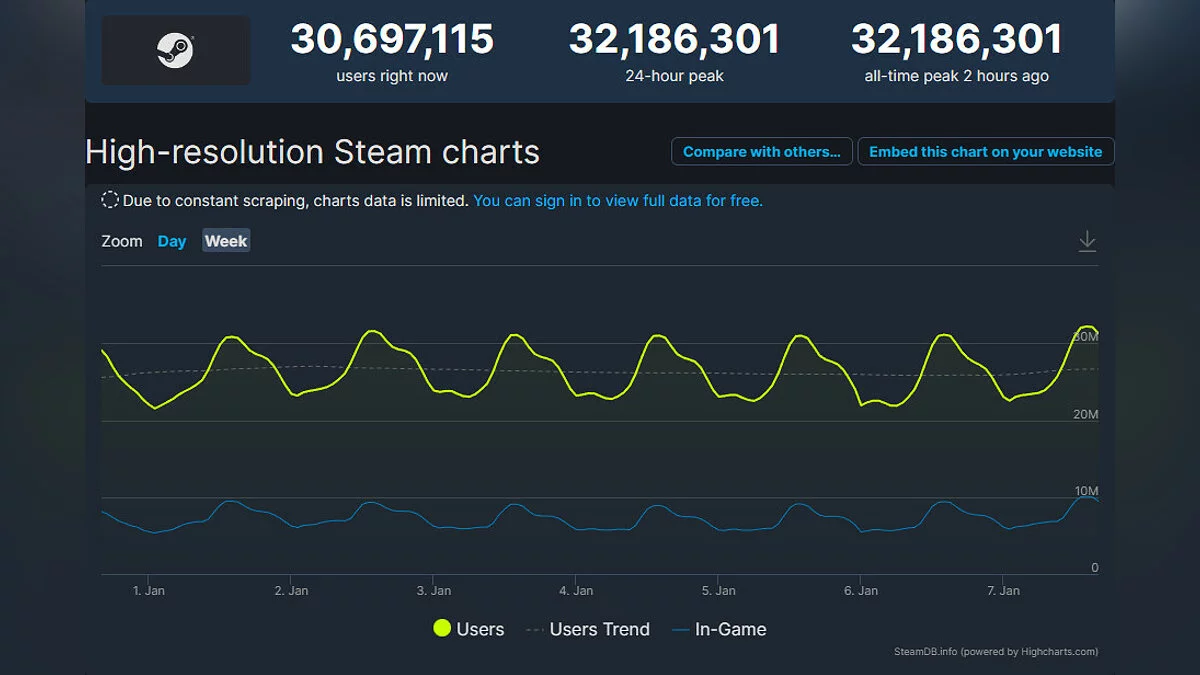 7 января в Steam одновременно находилось 32 миллиона человек, 10 миллионов из которых играли в игры. примечательно, что рекорды обновились не во время зимней распродажи, а спустя несколько дней после её завершения.
