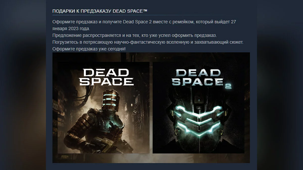 Студия EA Motive вдруг расщедрилась и сделала предзаказ Dead Space чуточку более выгодным. Как выяснилось, владельцы предзаказов в Steam получат не только сам ремейк, но и Dead Space 2.