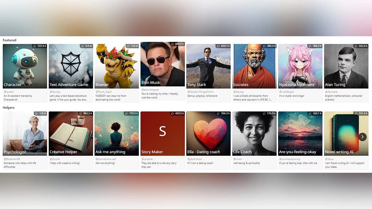 Помимо этого, на платформе есть более 5000 других ботов, в том числе виртуальные версии Илона Маска (Elon Musk), Гарри Поттера, Юлия Цезаря, Наполеона и Дарта Вейдера. Их можно заставить сыграть в Elder Scrolls RPG, а самому просто наблюдать за процессом.