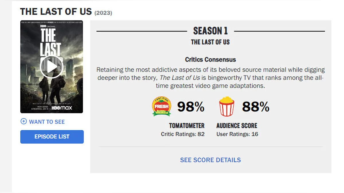 Ранее стали известны оценки и от журналистов — там шоу набрало целых 98%, став лучшей экранной адаптацией игр. Более высокие оценки получили только Arcane и Cyberpunk 2077: Edgerunners, но это анимационные проекты. А экранизация The Last of Us — проект с живыми актёрами.