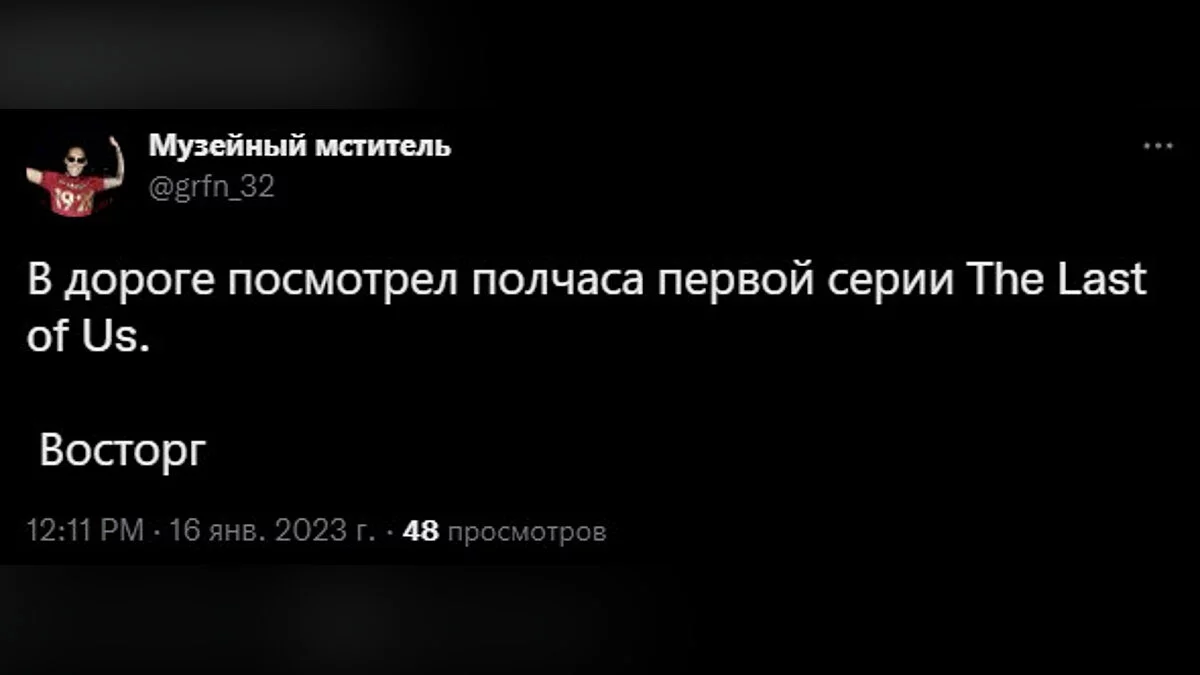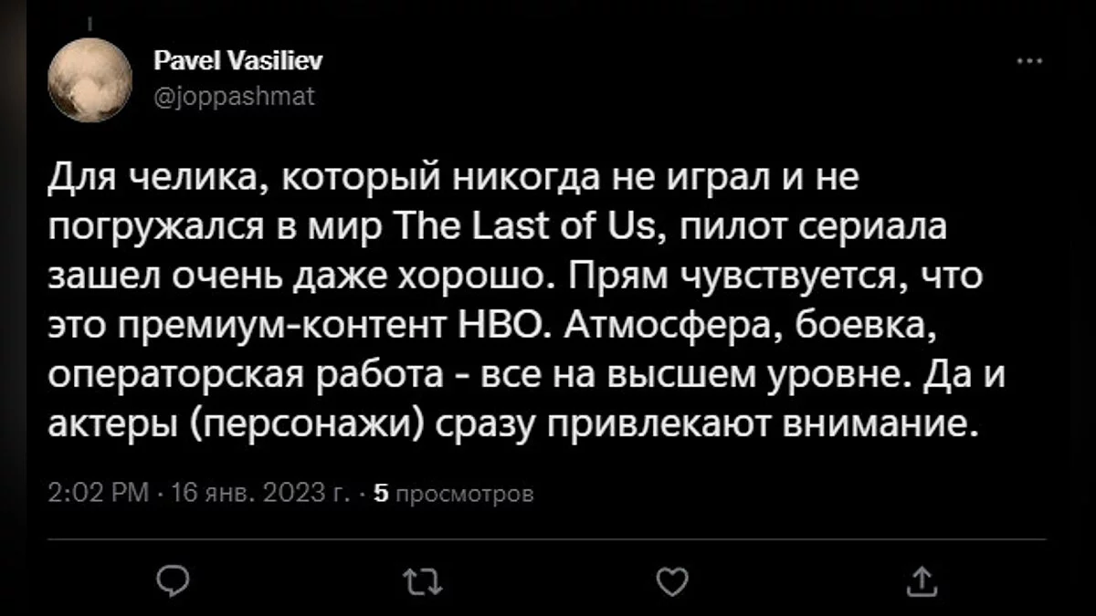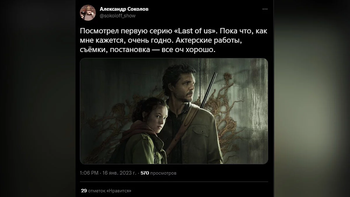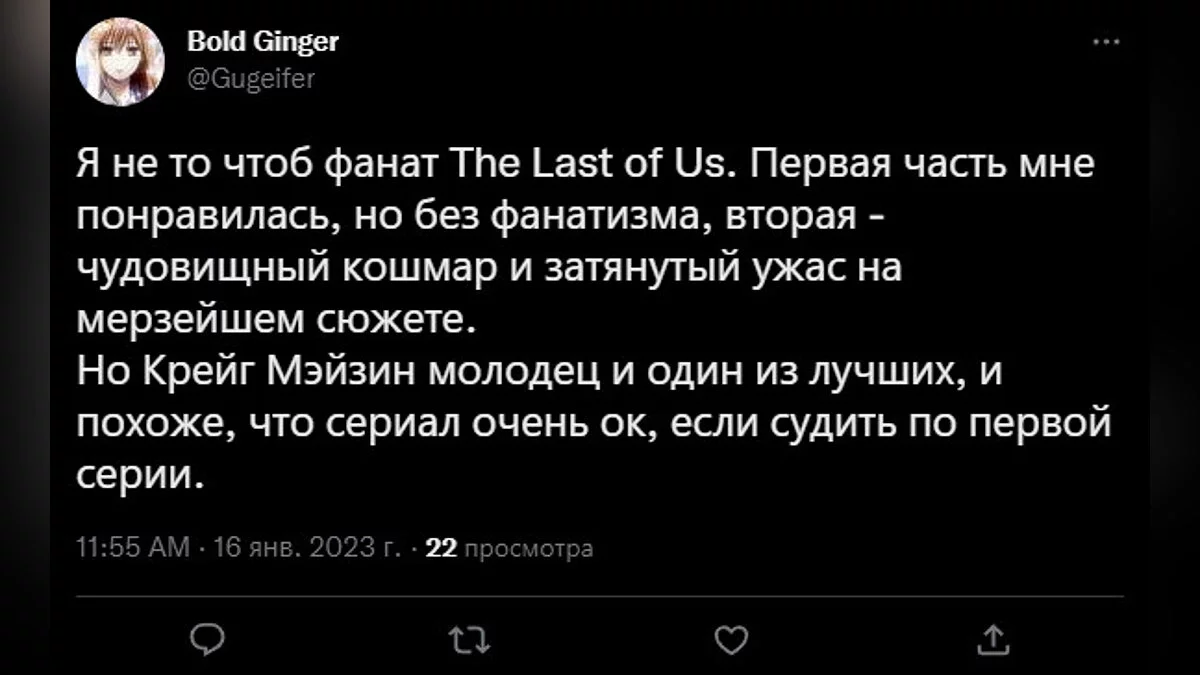 Сериал по The Last of Us (на русском он называется «Последние из нас») стартовал на высокой ноте. У шоу отличные оценки не только от прессы, но и от простых зрителей. Хвалят за внимательное отношение к первоисточнику (многие сцены в первом эпизоде воссозданы покадрово), актерскую игру Педро Паскаля (Pedro Pascal) и Беллы Рэмси (Bella Ramsey).