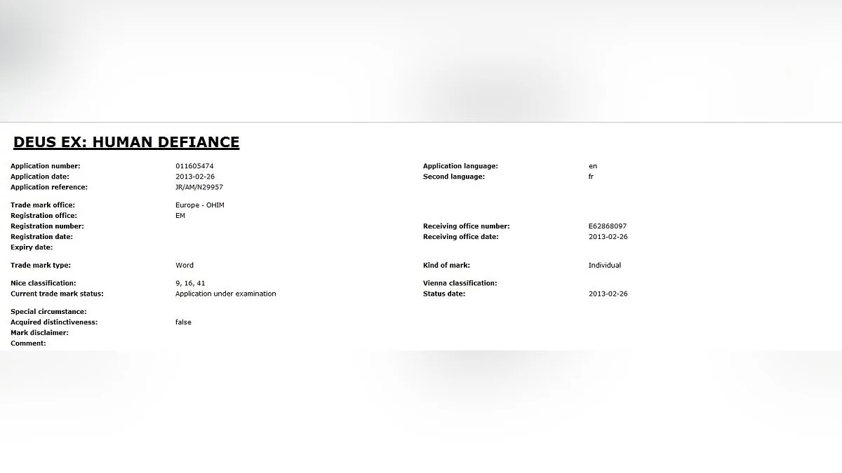Square Enix зарегистрировала торговую марку «Deus Ex: Human Defiance». Вероятно, это будет название для сиквела Deus Ex: Human Revolution.