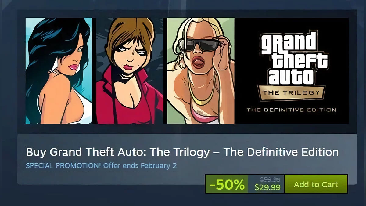 В Steam стал доступен сборник GTA: The Trilogy — The Definitive Edition, куда вошли ремастры GTA 3, Vice City и San Andreas. Сейчас его отдают со сидкой 50%.