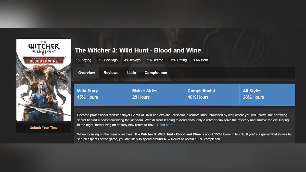На текущий момент звание самого большого DLC принадлежит «Крови и вину» для третьего «Ведьмака». Оно добавило полноценный новый регион и завершило сюжетную линию Геральта. По данным сайта HowLongToBeat, его полное прохождение занимает 28 часов.