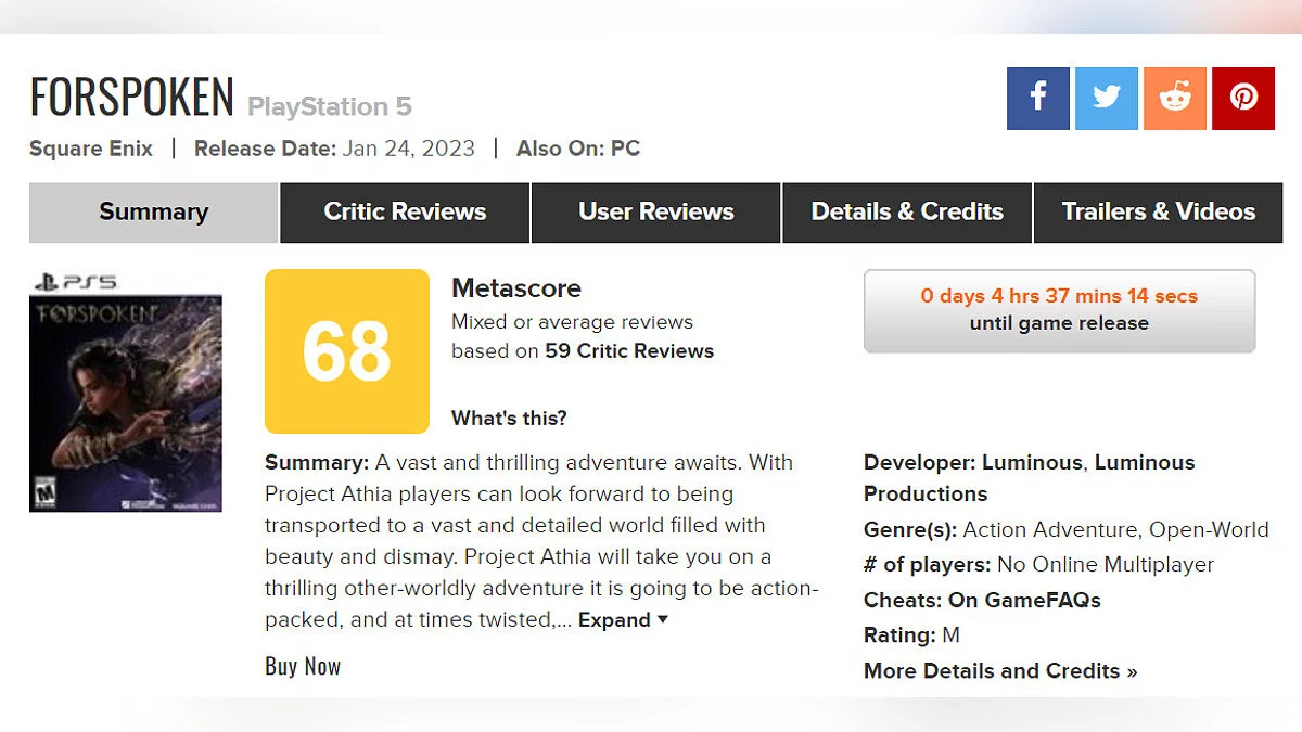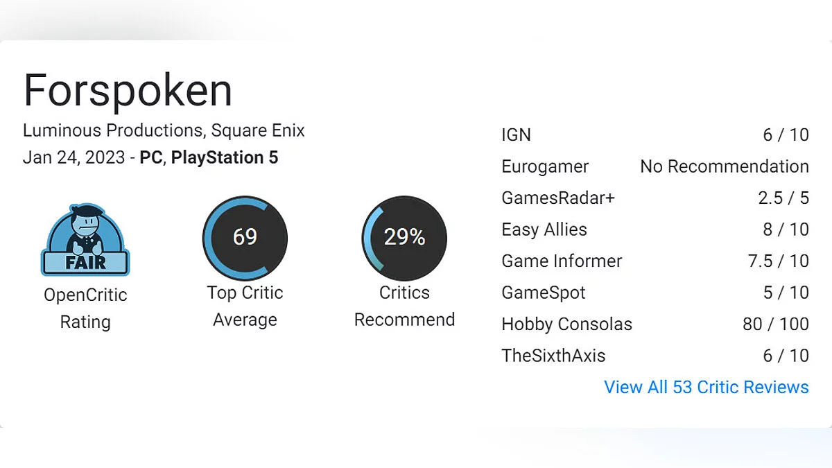 За день до релиза спало эмбарго на публикацию обзоров PS5-версии Forspoken. Как и ожидалось, игра оказалась довольно посредственной. Средняя оценка проекта на OpenCritic составила 69/100 баллов, на Metacritic — 68/100 баллов.