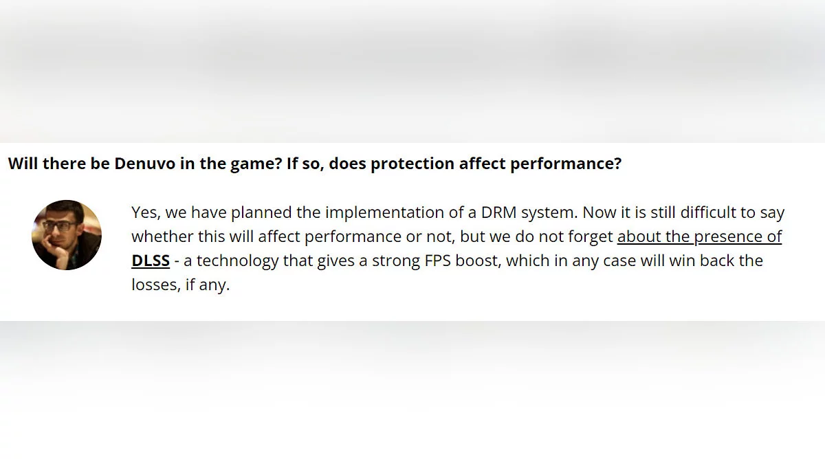 По словам Багратуни, игра поддерживает технологию NVIDIA DLSS, которая сможет компенсировать потери частоты кадров из-за использования Denuvo. Однако эта технология работает лишь на новых видеокартах NVIDIA — RTX 20, 30 и 40. То есть владельцы карт Radeon и Arc могут оказаться «за бортом». Примечательно, что Denuvo не указывается на странице игры в магазине Steam.