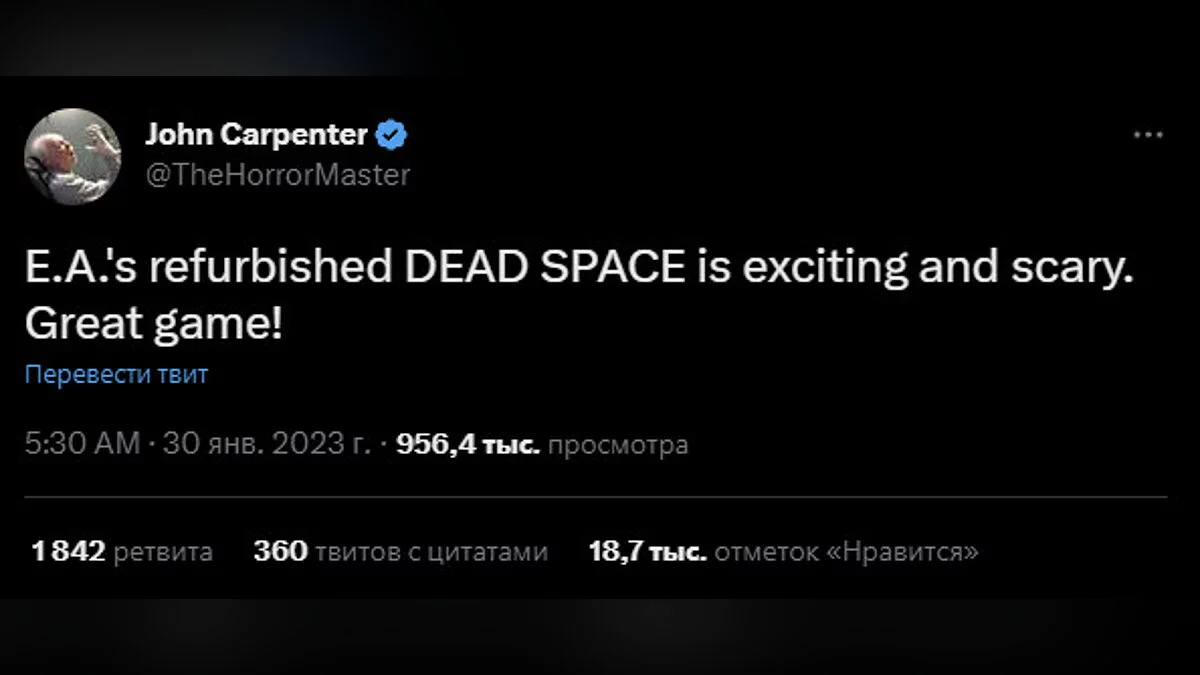 Разработчики из EA Motive уже поблагодарили «мастера хорроров» за высокую оценку. Правда, сам Карпентер после рождения внука просит называть себя «дедушкой хорроров».