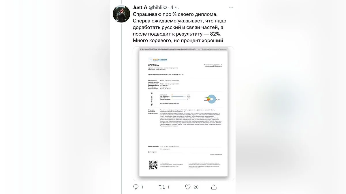 Тексты генерировались на английском языке. После этого их нужно было только перевести и объединить, а также проверить на ошибки. В итоге студент смог защитить работу и получить оценку «удовлетворительно», причём уникальность работы составила 82%.