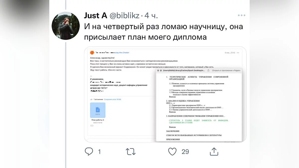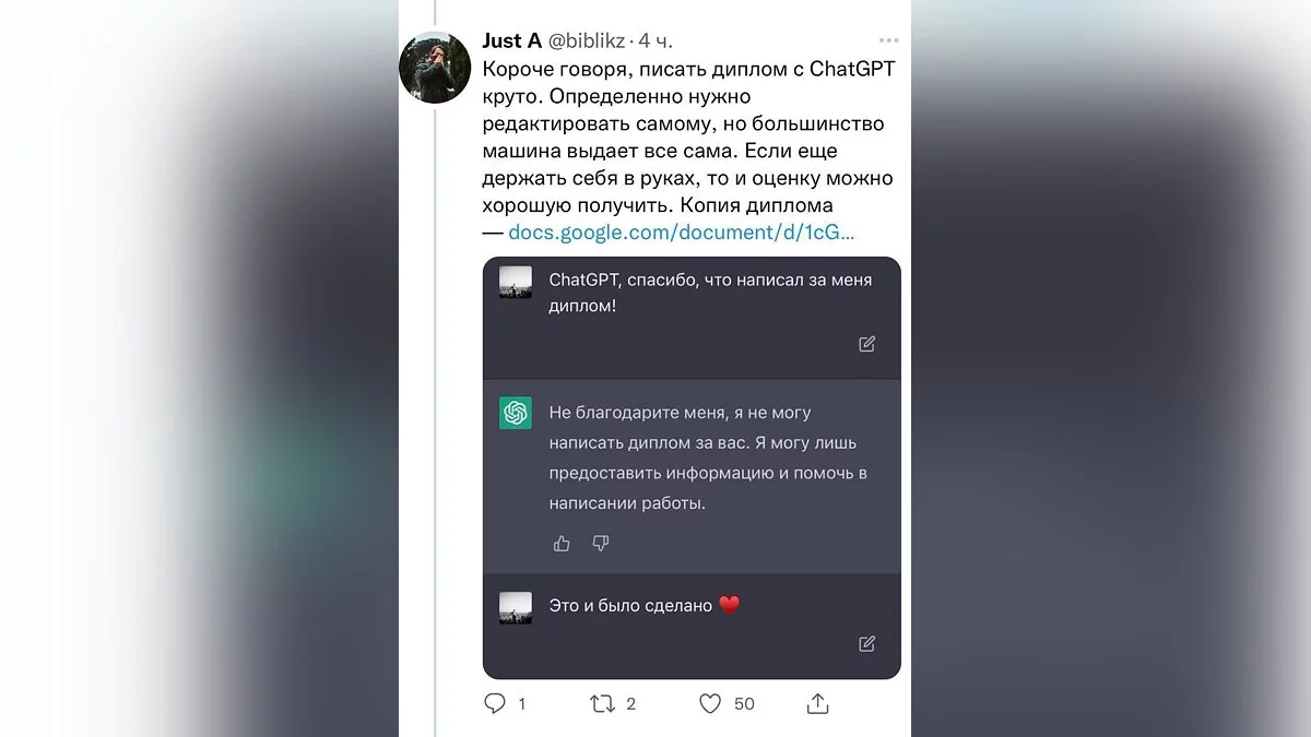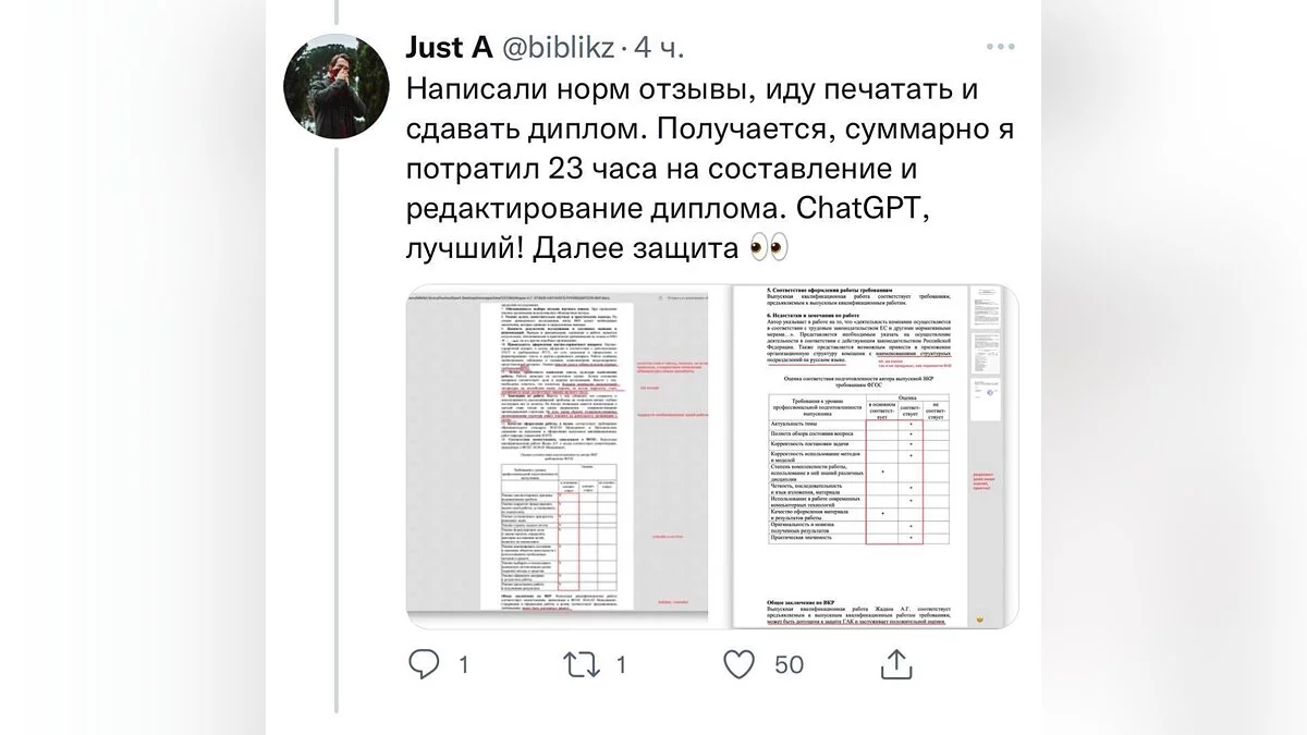 Будущее уже здесь — студент одного из московских вузов по имени Александр рассказал в Twitter, как он смог написать дипломную работу с помощью нейросети ChatGPT и даже защитить её. На всё это ушли сутки.
