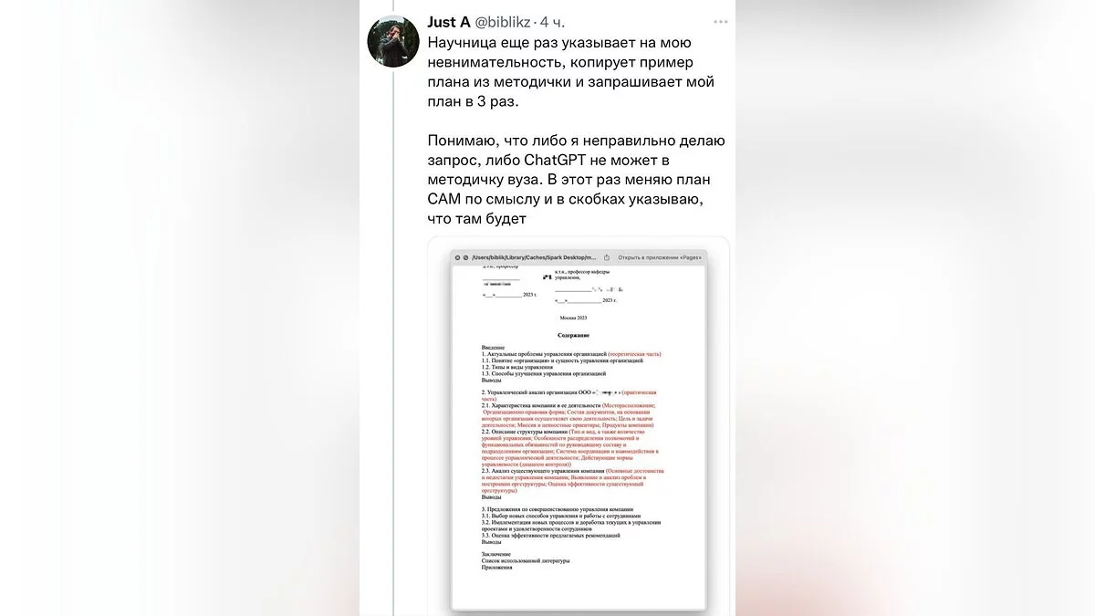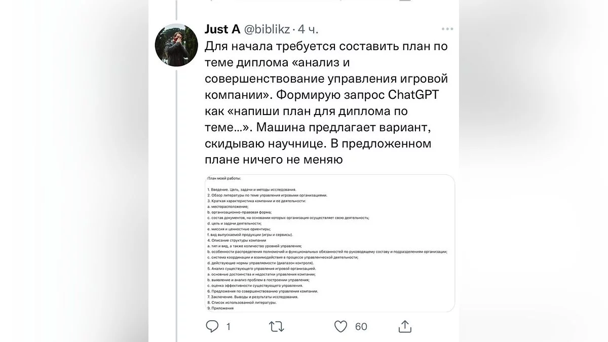Тема диплома звучала как «Анализ и совершенствование управления игровой компании». На первом этапе студент дал нейросети задание составить план работы, затем — сгенерировать тексты по каждой из тем. Выводы система сформировала уже сама.