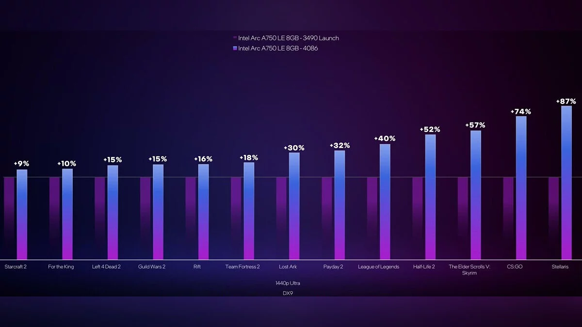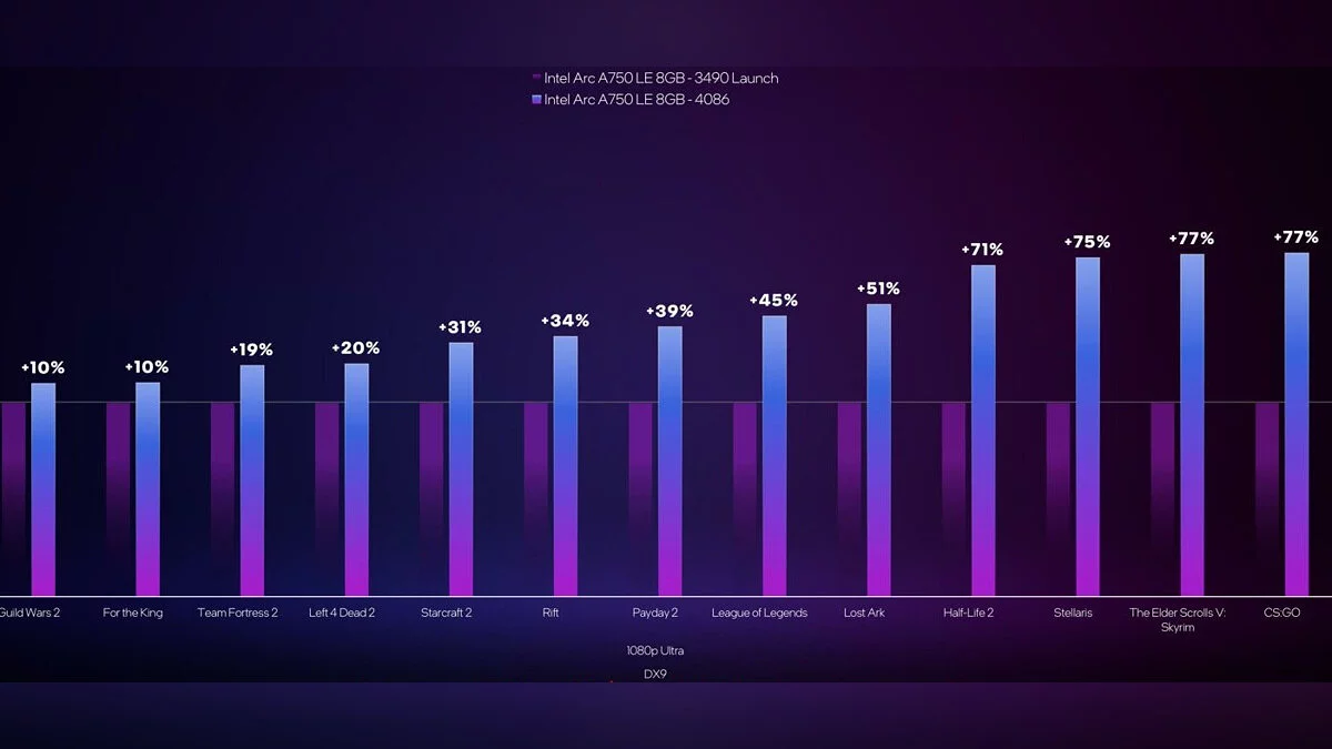 В Intel отметили, что прирост производительности обеспечил драйвер под номером 4086. Также утверждается, что в играх на DirectX 9 производительность выросла на 10–77%. А вот в играх с DirectX 11 и 12 показатели увеличились не так сильно, это признаёт и производитель. Там больше внимания уделялось стабильности.