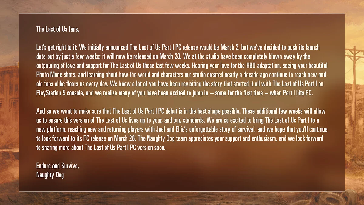 Naughty Dog сообщила о переносе ПК-версии ремейка The Last of Usс 3 на 28 марта. Причиной стало желание выпустить игру в наилучшем качестве.