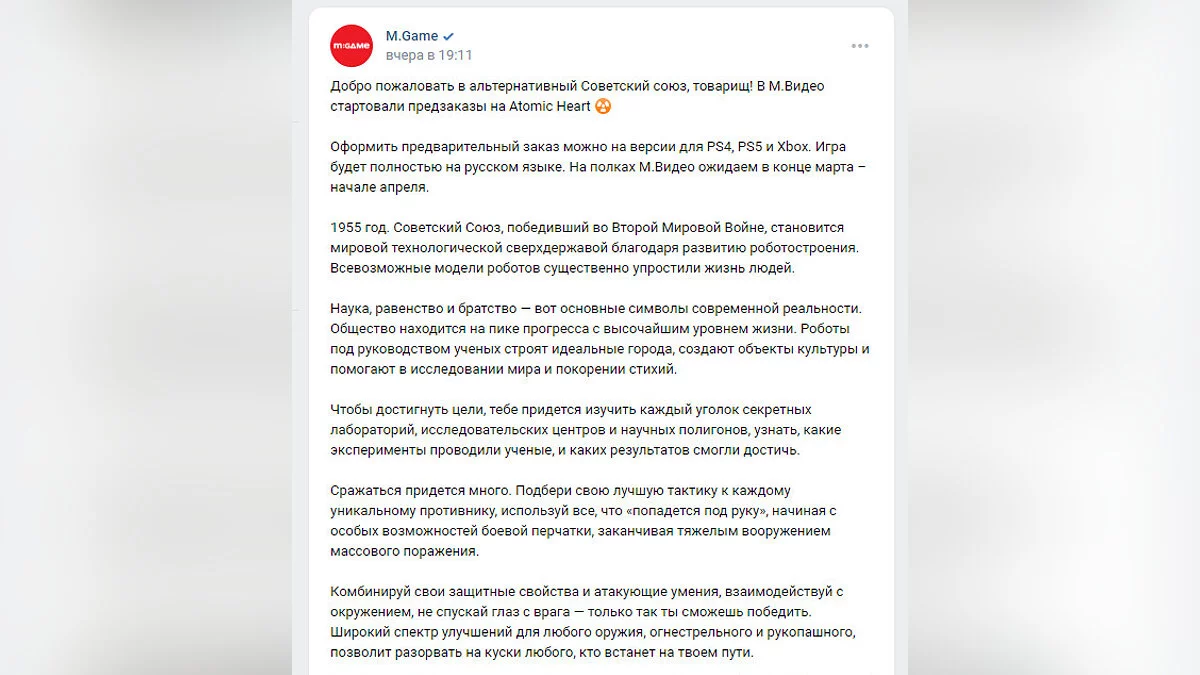 В официальной группе «М.Видео» в VK объявили об открытии предзаказов на консольные версии Atomic Heart. Игра стоит 5999 рублей для Xbox Series X/S, PS4 и PS5. Поставки начнутся в конце марта или начале апреля, при этом игра получит полную локализацию на русский язык.