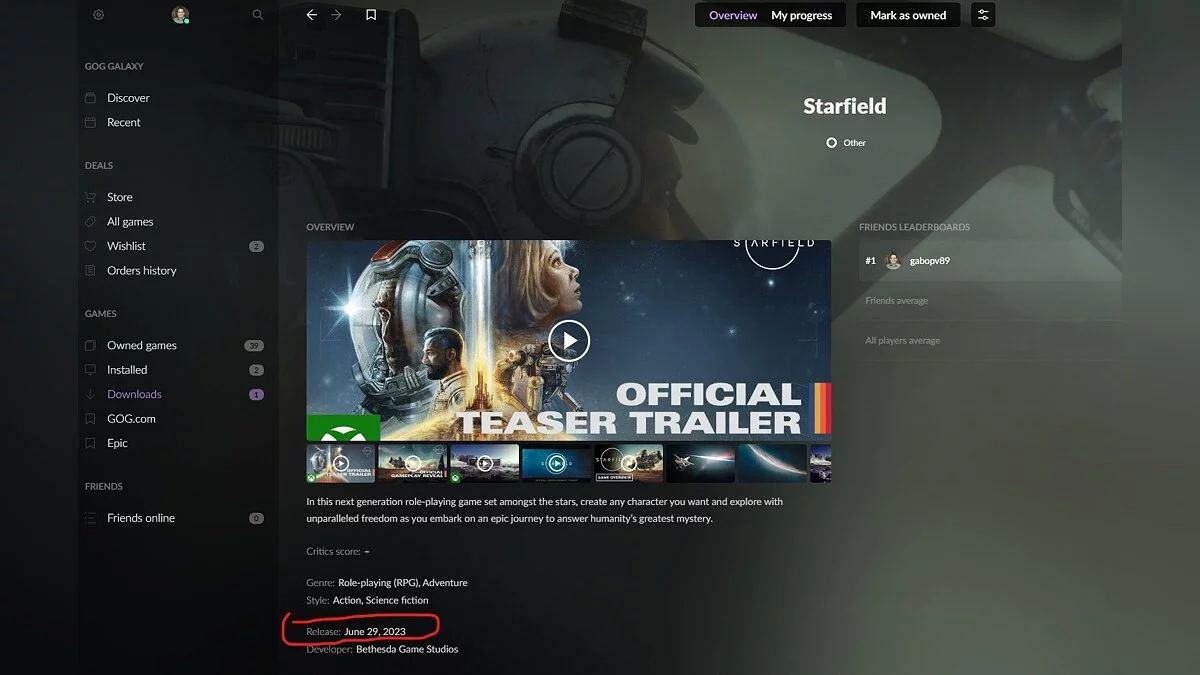 В лаунчере GOG Galaxy засветилась дата выхода Starfield, следующей большой RPG от Bethesda. На возможную утечку обратил внимание датамайнер Тайлер МакВикер (Tyler McVicker).
