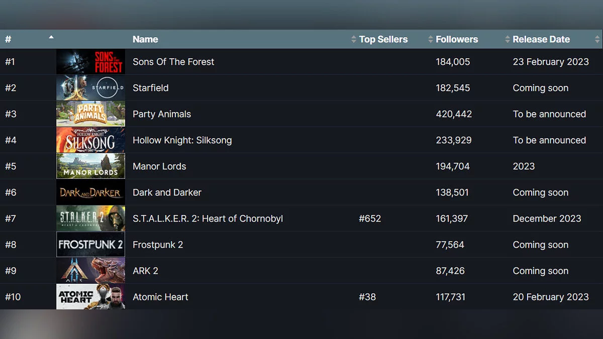 Sons of the Forest возглавила топ игр, которые наибольшее количество раз добавили в список желаемого. Однако точное количество человек, которые добавили её в свой список, не раскрывается. Известно лишь, что на игру подписано 184 тысячи геймеров. Выживалка смогла обойти Starfield, Hollow Knight: Silksong, S.T.A.L.K.E.R. 2, Atomic Heart и другие ожидаемые проекты. Три месяца назад, напомним, хоррор-выживалка была на 10 месте в топе.