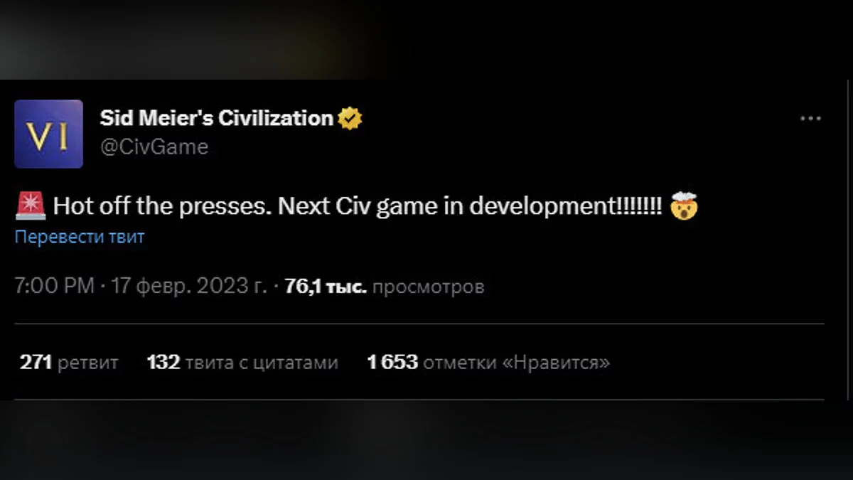 Firaxis Games официально объявила о разработке седьмой части «Цивилизации». Подробностей игры пока нет, разработчики просто поделились новостью в Twitter.