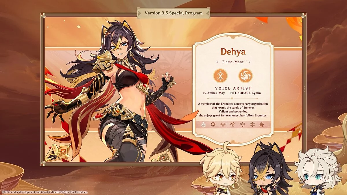 Также был раскрыт состав баннеров. Первая половина: Дэхья и Сайно, вторая: Аяка, Шэнь Хэ и Мика. Четырёхзвёздочных героев, который попадут в баннеры, назовут позже. Дэхья попадёт в стандартный баннер после обновления 3.5.