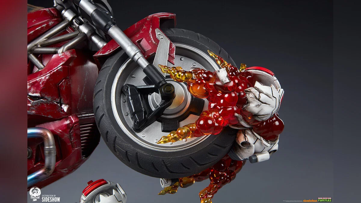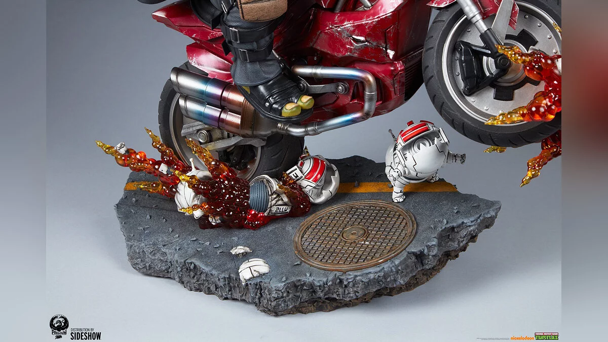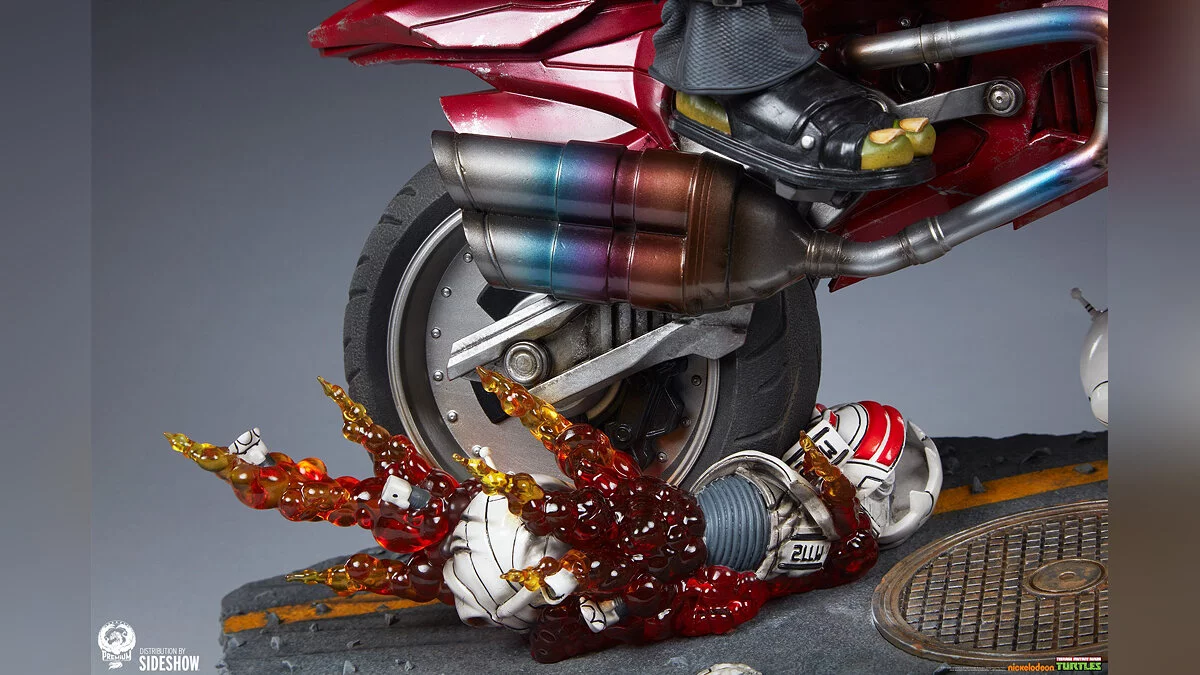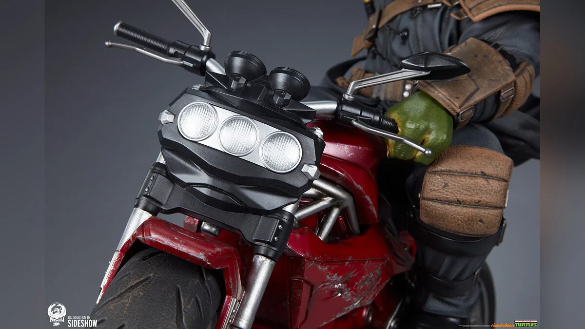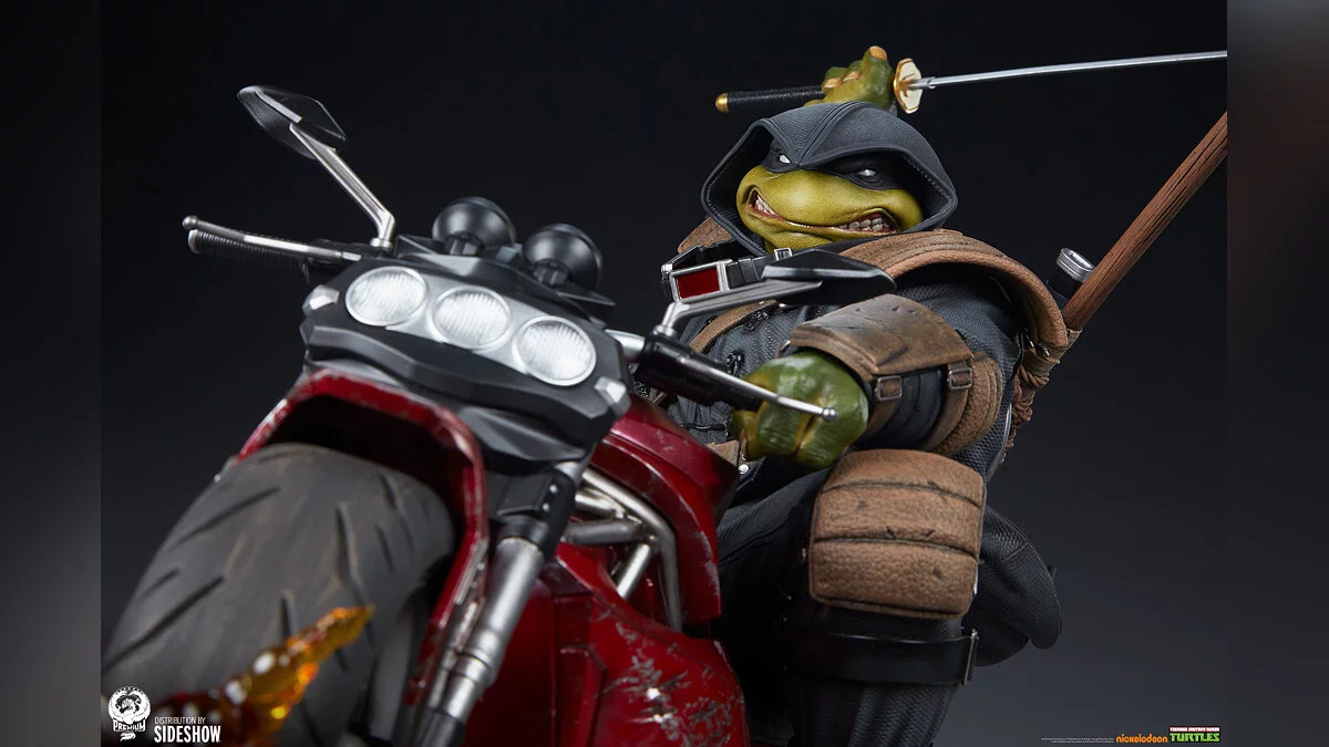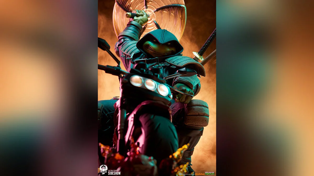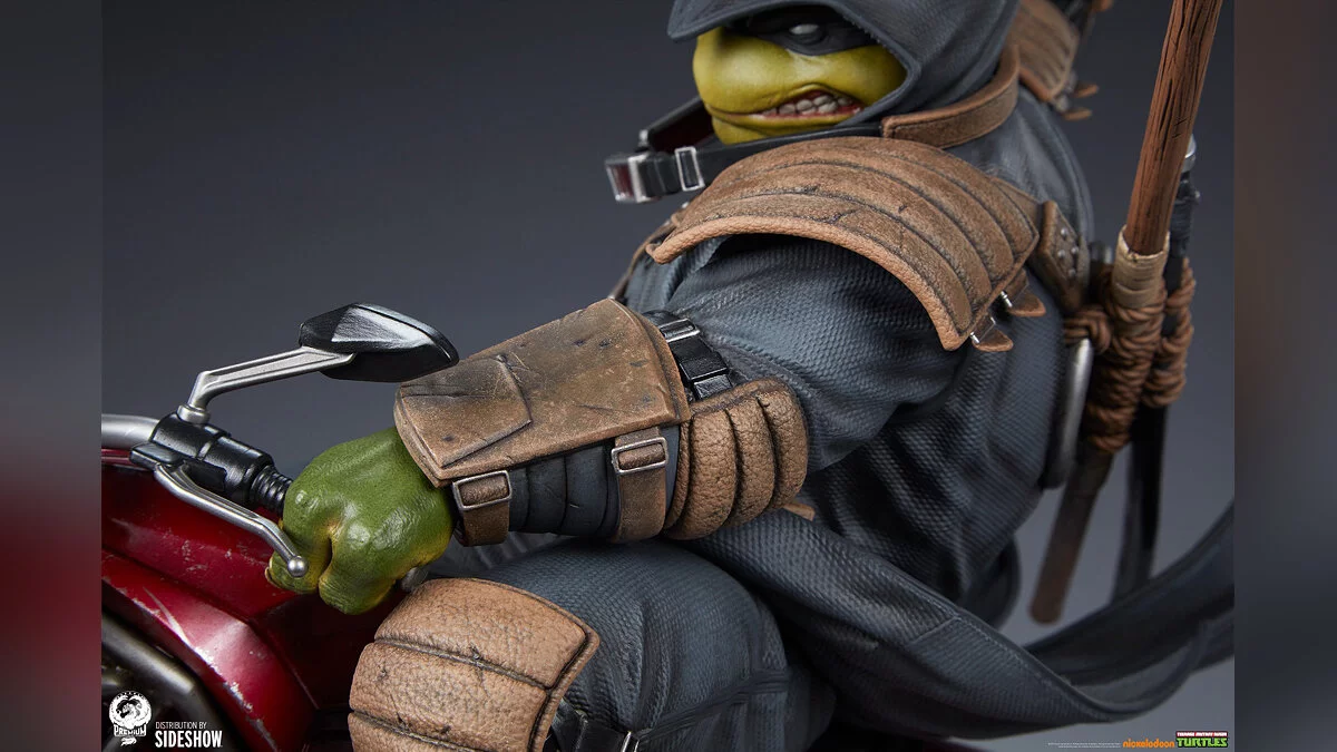 Герой изображен сражающимся верхом на футуристичном байке. На нем можно заметить все каноничное оружие: нунчаки Микки, меч Леонардо, посох Донателло и саи Рафаэля.