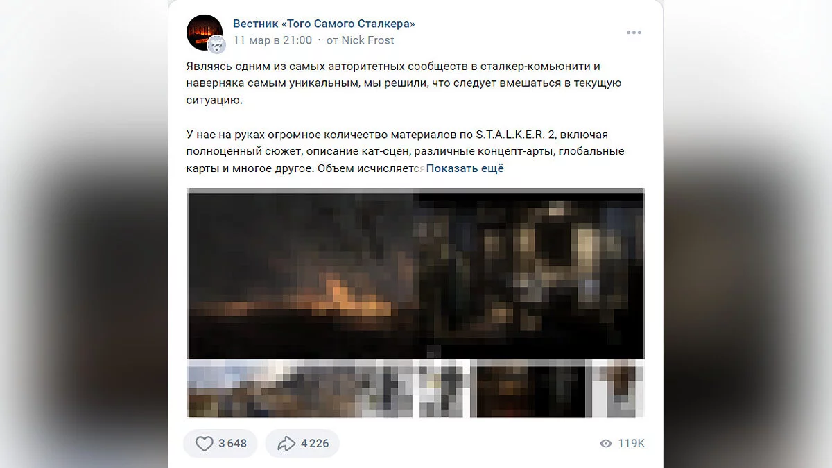 Автор утечки заявил, что заполучил в свои руки около 30 ГБ материалов по S.T.A.L.K.E.R. 2, включая полное описание сюжета и кат-сцен, концепт-арты и не только. Он обещает опубликовать весь этот контент, если до 15 марта компания GSC Game World не выполнит три условия: извинится перед игроками из России и Беларуси, разбанит аккаунт в Discord-канале игры и вернёт русскую озвучку.